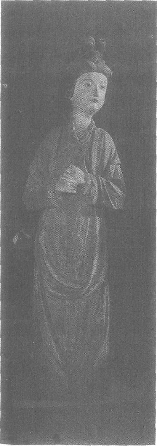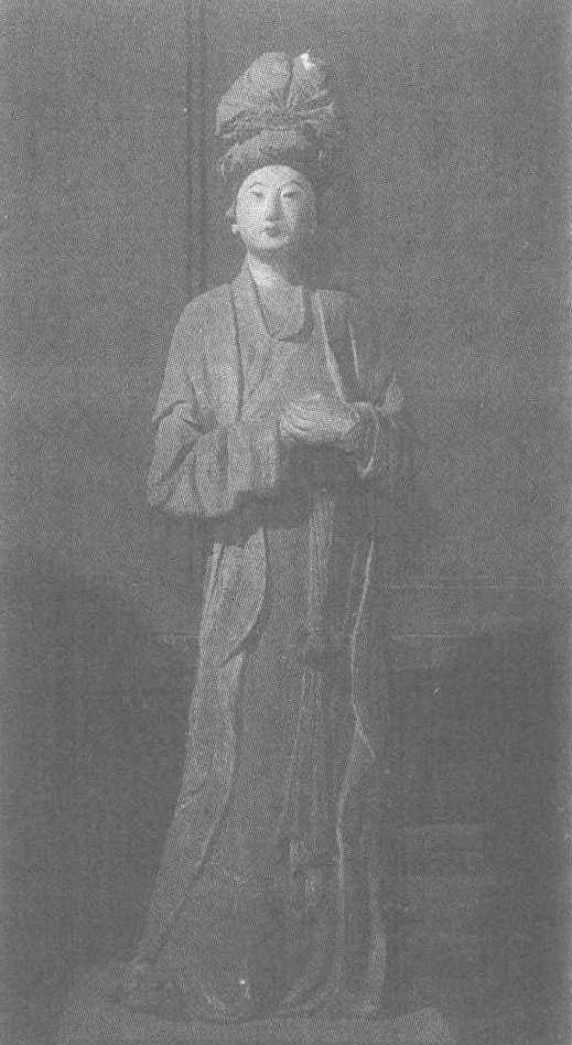 北宋元祐二年(公元1087年)。通座高165厘米。山西省太原市晋祠圣母殿内塑像。此侍女身材修长,腰胯微左移,立姿自然,具有女性柔媚的风采。乌发后拢,一绿巾做成花饰装饰秀发。内着红衣,外罩绿色长衫,与头上的绿巾色彩匹配,服饰合体而艳丽,双手捧于胸前,凝目沉思,是一个性格内向、少言寡语的女子形象。