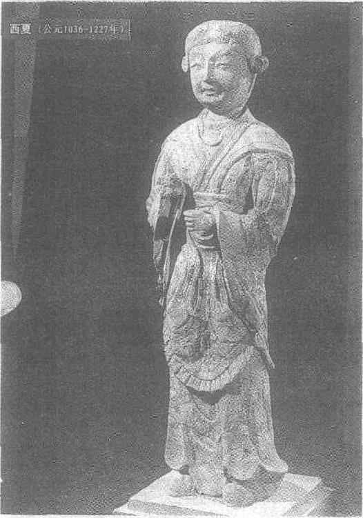 西夏。高67厘米。甘肃省敦煌县莫高窟第491窟西龛南侧。此为释迦佛身旁的一尊供养天女。头顶发平直,两侧梳垂鬟髻。面庞方圆,颧骨外突,细目小唇,笑意挂面,流露出朴实而稚气未脱。身穿袿衣,脚蹬翘头履,身体各部位比例适宜,造像风格具有西夏的典型性。