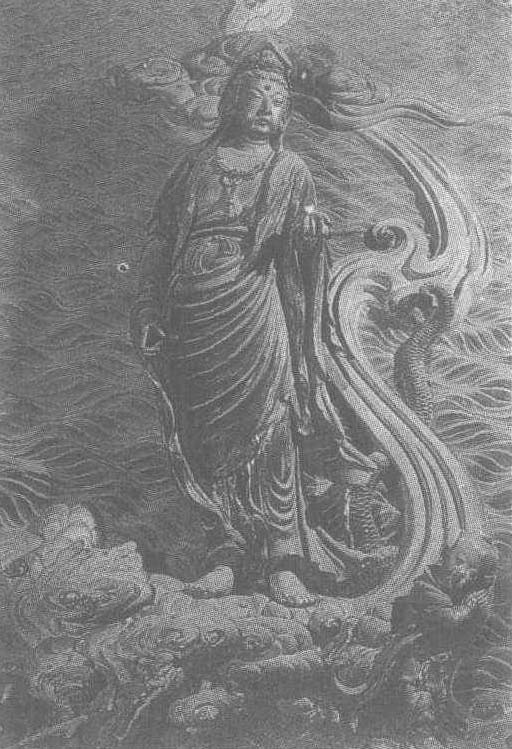 释义 | 彩塑渡海观音像 彩塑渡海观音像元。通高166厘米。山西省新绛县福胜寺内塑像。福胜寺在新绛县西北17公里处的光村,唐贞观年间敕建。现存建筑、彩塑以元明两代为主。弥陀殿建于元代,殿内所奉弥陀和观音皆为建殿时原作。渡海观音位于主尊背光之后。观音头戴风帽,身披宽松长衣,脚踏一朵雾气缭绕的祥云。重心在右脚,身体向后微倾。右手自然下垂,左手手心向上飘然轻扬,姿态十分优美。面庞丰满圆润,神态安详宁静,带有至尊的气质。背景为碧波翻卷的海水。左侧脚下有一善才童子在参拜。此塑像设计完美,将人物、海水、祥云三者有机结合在一起,有静有动。工艺精细,观音衣衫随风而起的皱褶,童子满脸可爱的虔诚,均刻画巧妙,增加了整体的艺术效果。 ☚ 彩塑宋帝王像 木雕老君像 ☛ 彩塑渡海观音像 彩塑渡海观音像明。高248厘米。四川省新津县观音寺观音殿后壁。在大殿内主尊的背面塑渡海观音是当时一种流行作法。此渡海观音立于鳌头之上,手握净瓶,其面容端庄、沉稳,肌肤丰润,胸佩璎珞,衣裙随风飘扬,自然飘洒,背后呈现大海的汹涌波涛,普陀山隐现于海浪之中。这一具有强烈动感的背景,与观音的安详自如形成鲜明对比,动静相衬,完美和谐,充分体现了民间工艺大师的精湛技艺,是明代寺庙雕塑中的精品。 ☚ 木雕贴金千手千眼观音 悬塑善财童子像 ☛ |