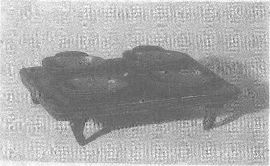 | 释义 | 彩绘云纹漆案 彩绘云纹漆案西汉晚期。长21厘米,宽15厘米,高7厘米。江苏省扬州市西湖乡胡场一号汉墓出土。扬州博物馆藏。木胎,长方形,四条内翻马蹄足。体髹朱、紫红、黄、灰、绿等色漆绘成的几何纹、卷云纹。纹饰有简有繁,有重有轻。出土时案面上附置数只大小相等,形制相同的耳杯。杯内髹红漆,外髹褐漆,口沿及耳有朱绘卷云,及雀等纹饰,与案配置成套。