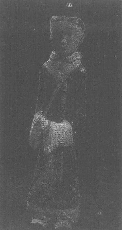 西汉。高50厘米。1986年江苏省徐州北洞山西汉墓出土。陶俑脸形上宽下尖,眉细弯如弓,双目圆睁,神态肃穆,表情机敏。头戴冠,黑带系于颏下。身穿右衽深色衣,近袖口部为白色,涂红缘。腰束白带,右侧悬红色绶带,并系一玉佩。脚蹬翘头履。此俑制作时以厚厚的一层白彩作地,再施以各种色彩,将雕塑和绘画艺术融为一体。彩绘线条流畅,色彩鲜艳,是汉代陶俑中的杰出作品。据考古工作者推测,此墓主人是西汉早期分封到这里的某一代楚王。同墓出土的未经扰乱的彩绘陶俑共200余件,它们不仅具有较高的艺术价值,也是研究西汉诸王仪卫制度的重要实物资料。