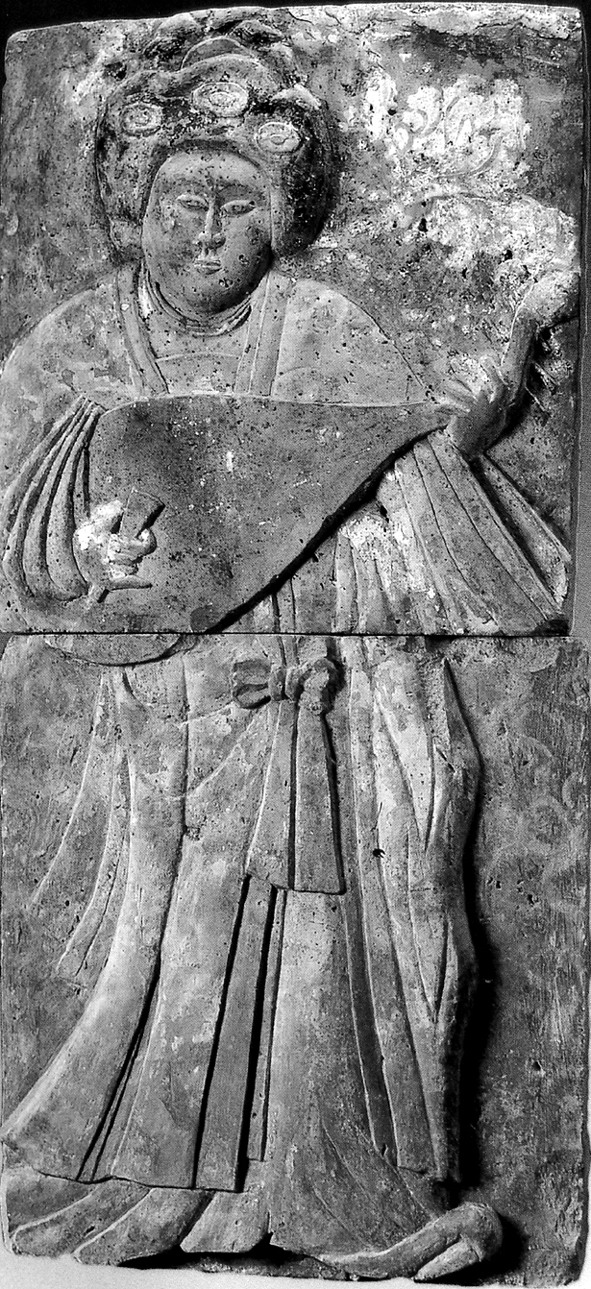 释义 | 彩绘女琵琶浮雕砖 彩绘女琵琶浮雕砖cɑihuinü pipɑ fudiɑozhuɑn1992年彬县底店乡前家嘴村五代冯晖墓出土。由2块砖雕上下拼成1幅完整人物,镶嵌于墓室甬道西壁。人物高0.77米,头饰抱面高髻,戴花三朵,插红色梳。颈饰三周项链,内为红色抹胸,红色曳地长裙。外套开领广袖红色长衫。腰饰双环节绦带,背部也有绦带下垂。双手抱曲颈琵琶于胸前,左手按弦,右手执拨子弹奏。身体呈S状曲线,姿态优雅。现藏彬县文化馆。 ☚ 彩绘女侍俑 彩绘女答腊鼓浮雕砖 ☛ |