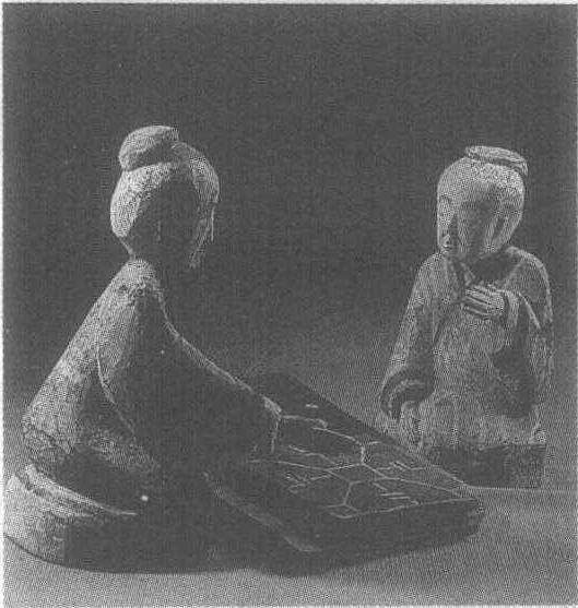释义 | 彩绘木雕六博俑 彩绘木雕六博俑东汉。高28.5厘米。甘肃省武威县出土。甘肃省博物馆藏。对弈二俑为两位老者,头挽高髻,相对跪坐于棋盘两边。一老者右手执子,盯着棋局凝神思考,欲落还休;另一老者左手屈于胸前,右手抚膝,观察着对方的神态,仿佛想从中探究出对方正在想什么,宁静中含着紧张。此木俑刻画生动逼真,富于内心和环境氛围的表现,是汉代彩绘木雕中罕见的珍品。 ☚ 木尺 木雕独角兽 ☛ |