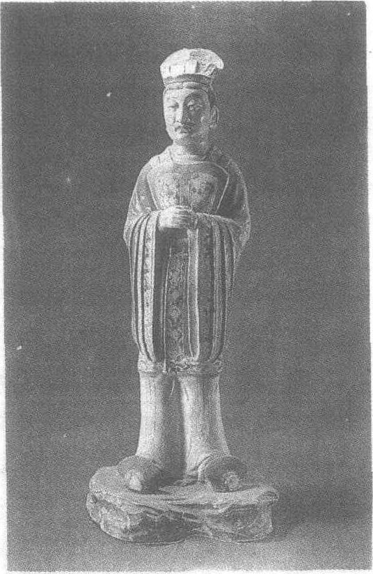 唐。通高69厘米。1972年陕西省礼泉县郑仁泰墓出土。陕西省博物馆藏。俑五官端正,目光镇定,神态从容,温文尔雅,分脚稳立于石上。头戴梁冠,身着彩绘勾边红色官服,外套彩色裆(裆为北方民族服饰,形似今日背心,肩部用皮制褡袢联缀,腰间用皮带系扎)。脚登黑色翘头靴,双手拱于胸前。此俑不仅再现了唐朝廷文官的生动形象,也为研究唐早期的雕塑艺术提供了很好的实物资料。