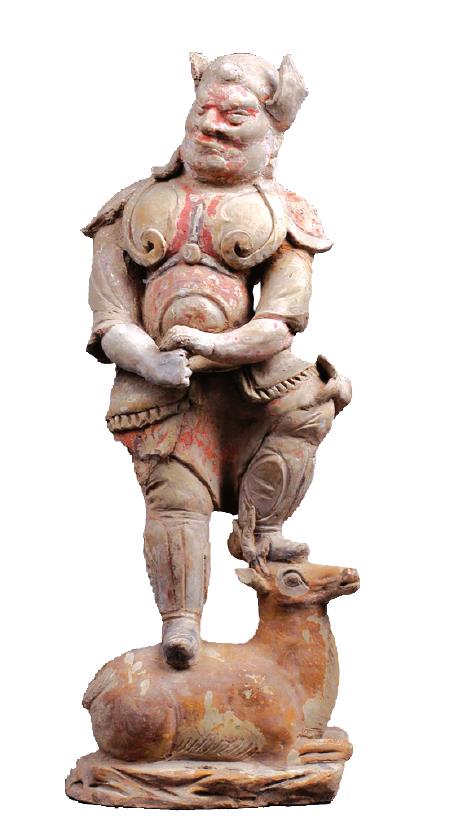 释义 | 彩绘陶天王俑 彩绘陶天王俑陶器。国家一级文物。永安寺舍利塔地宫内出土。一尊高 64 厘米,一尊高 54 厘米。陶俑头束高髻,深目高鼻,双目圆睁,怒视前方,身穿金甲,腰系红色战袍,腿裹行藤,脚蹬毡靴,身材比例恰当,肌肉发达、健美,显示了武士的无穷力量。天王身材魁梧,右手握一兵器(缺)、左手作“施无畏”印,两足踏在恶鬼身上,恶鬼头长独角,两臂肘撑地仰卧,张口哀号,神情惊恐万分。1992 年,赴日展出。现藏天水市博物馆。 彩绘陶天王俑 ☚ 三兽足单耳红陶罐 陶舞马 ☛ |