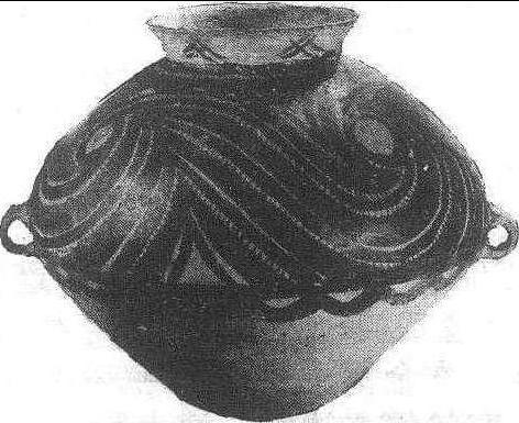 释义 | 彩陶瓮新石器时代,甘肃马家窑文化半山期。高34、口径18.3、腹径40.8厘米,短颈、喇叭状口、口沿较规则、广肩、鼓腹、下部内收较大、平底。双耳设于腹部最宽处、器型膨圆、端庄秀丽。土黄色陶衣上施以黑褐色彩绘。器身主题图案为四大连续旋涡纹,线条流畅,运笔娴熟。旋涡纹由几层条纹组成,线条粗细相间,每一条粗线上均有锯齿纹,齿尖向上,整个图案自器腹中部向上至颈部,用两条直线截住。底线下又有一条大波浪纹。颈部对称地勾画出四个井字形几何纹,器身下部空白。旅顺博物馆收藏。 彩陶瓮 |
