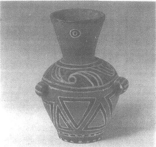 新石器时代大汶口文化。高17厘米,口径7.1厘米。山东省泰安县大汶口出土。北京中国历史博物馆藏。顾名思义,这是一件水器。因其造型独特,纹饰醒目,给人留下深刻的印象,而绝无与其他文化的彩陶有混淆之嫌。水壶的形制为深喇叭口、垂肩、收腹、平底,肩有两个环形耳。这种形制的背水壶为大汶口文化所特有。其胎质为泥质红陶,肩绘变形云纹,腹部以大小不等的三角纹装饰,近底处有串珠纹两圈。所用彩料为黑白两色,其中白色的使用极为巧妙,作为红黑两个主色的对比色,大大提高了整体色调的亮度,使人备感悦目。此外,壶的口沿下部绘有白色同心圆纹,它与壶腹的繁满纹饰相呼应,使腹部纹饰的满胀感得以释放,看似信手绘出,实则精心点缀,反映出新石器时代大汶口人的艺术情趣。大汶口文化见“玉铲”条目。