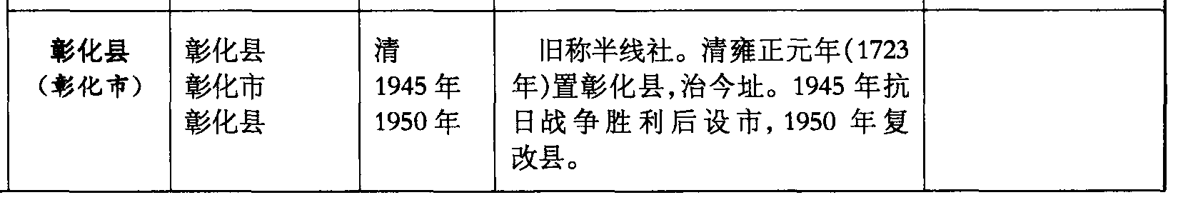 彰化县(彰化市)彰化县彰化市彰化县清1945年1950年旧称半线社。清雍正元年(1723年)置彰化县,治今址。1945年抗日战争胜利后设市,1950年复改县。