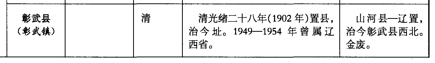 彰武县(彰武镇)清清光绪二十八年(1902年)置县,治今址。1949—1954年曾属辽西省。山河县—辽置,治今彰武县西北。金废。