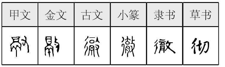 chè表意,甲骨文、金文从鬲从又,又为手,象吃完了食物后以手撤去食具之形,《说文》古文和小篆字形增彳,隶定为“徹”。本义表示撤去、撤除(与“撤”同)。(一说“徹”为形声,从彳,其余部分为音符,本义为道路畅通无阻。)引申为拆除、撤退、通透等。近代俗字、《简化字表》简作“彻”,形声,从彳,切声。 |