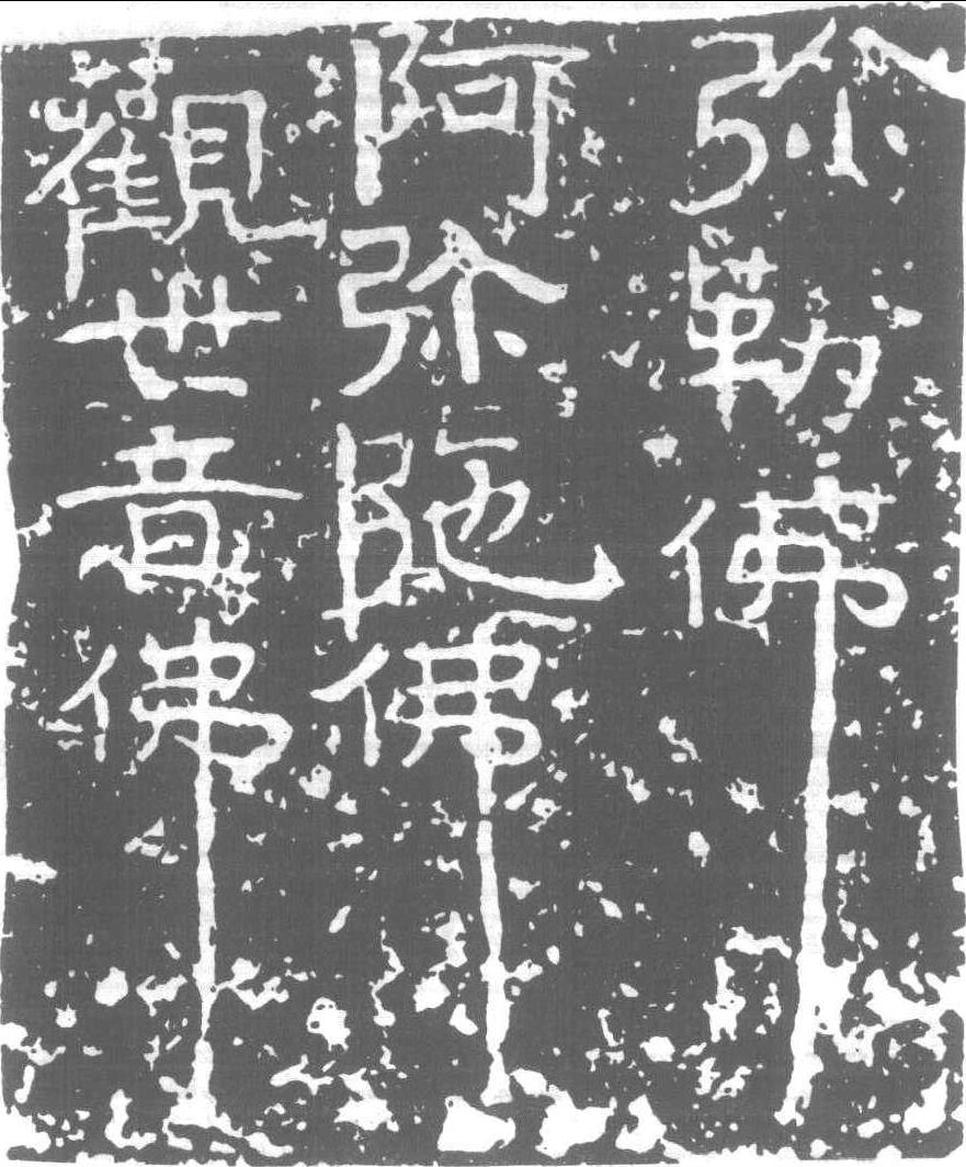 释义 | 徂徠山摩崖徂徠山摩崖 (王子椿題名) 刻於山東徂徠山(隔汶河,與泰山相對)映佛岩之般若經九十八字、佛號、王子椿題名、年紀等之總稱。俱為北齊·武平元年 (570) 刻成。恐係令王子椿書。書勢縱逸,筆法快適。佛號四種皆大字,“佛”字右竪伸長,尤其“彌勒佛”之“佛”字右竪長達兩尺。<文殊般若經碑>九十八字,尤為世重。本書有專項叙說。→見 【四山摩崖】 徂徠山摩崖 (佛號四種) |