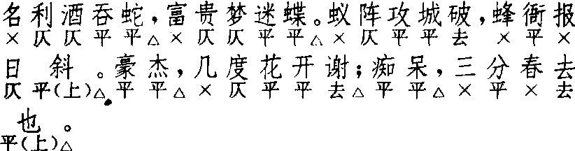 △。各句对否均可;如首四句作两对,后四句作隔句对,与〔雁儿落〕两对相配合,则极为整齐对称。首句前常加“呀”字。《中原音韵》“作词十法”谓〔得胜令〕须叶平韵,实际元人叶上韵者亦不少,名家如关汉卿《救风尘》、《单刀会》、白朴《墙头马上》、高文秀《遇上皇》、《谇范叔》、王实甫《西厢记》、马致远《青衫泪》等都是。后四句句式有变异,如高克礼“新愁因甚多”曲:“不恨你个冤家,高烧银蜡,宽铺绣榻,今夜来么。”变为四个四字句。类似的现象,邓玉宾“乾坤一转丸”带过曲曾被用入南戏《幽闺记》第七出《文武同盟》,其〔得胜令〕后四句亦变为:“险些儿误杀了个英雄汉,凄凄冷冷,埋冤世间”。这种变化盖出于北曲南化之故。小令兼用。小令除与〔雁儿落〕接用为带过曲外,亦可单用。入套除两曲连用外,亦偶可分用,即两曲中间以他曲;或先用〔得胜令〕,间以他曲,再用〔雁儿落〕;但均少见。亦入〔商调〕。