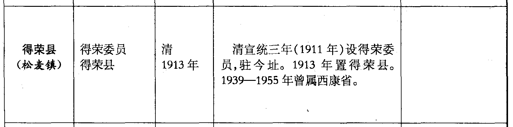 得荣县(松麦镇)得荣委员得荣县清1913年清宣统三年(1911年)设得荣委员,驻今址。1913年置得荣县。1939—1955年曾属西康省。