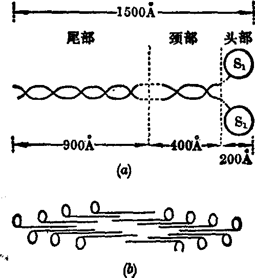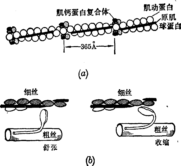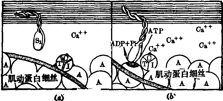 图2 心肌蛋白结构示意图 Ca++是心肌兴奋时电活动与机械收缩的偶联者。当心肌兴奋去极化时,Ca++从细胞外转移到细胞内,同时也从肌质网内释放入胞质。因此胞质内Ca++浓度可由10-8M升高到10-5M。此时,肌钙蛋白的TnC迅速与钙离子结合。这种结合一方面使肌钙蛋白的TnI从肌动蛋白移开,而使肌动蛋白的受点暴露; 另一方面作用于TnT,使其与原肌球蛋白的结合状态发生改变,使原肌球蛋白旋转到肌动蛋白的两条螺旋状肽链的深沟中,从而使肌动蛋白的受点与肌球蛋白的头部相接触,形成横桥。S1的ATP酶作用于ATP而释放能量,肌动-肌球蛋白乃发生收缩。心肌收缩完毕后,由于Ca++又重新排出细胞外或进入肌质网,胞质内游离钙浓度由10-5M又降至10-8M。此时,肌钙蛋白的TnC失去了Ca++,TnI又与肌动蛋白的受点结合,TnT又恢复兴奋前与原肌球蛋白的结合位置,使原肌球蛋白又从肌动蛋白的深沟中转出来,肌动-肌球蛋白重新分解为肌动蛋白和肌球蛋白,心肌乃舒张(图3)。 从心肌分子结构及兴奋-收缩偶联过程的基础出发,可以认为心力衰竭的发生与以下几个环节有关。 1. 能量来源和能量生成障碍: 正常心肌以脂肪酸为主要能源(约占供能物质总量的2/3)。严重心力衰竭时,由于心肌缺血缺氧,造成脂肪酸的氧化减慢,心肌能量来源不足,因而葡萄糖成为心肌的主要供能物质。但此时因心肌缺血缺氧,糖的无氧酵解加强,氧化不全,使能量生成不足。而且心力衰竭时,由于胰腺供血不足,胰岛素分泌减少,血糖也不易进入心肌细胞,使心肌供能物质进一步缺乏,能量生成明显减少。 ![]() 图3 心肌收缩(b)、舒张(a)时收缩蛋白的变化 2. 能量利用障碍: 心肌氧化磷酸化过程中所产生的ATP,在心肌兴奋-收缩偶联过程中受到肌球蛋白头部ATP酶的作用而水解,为心肌收缩提供能量。心力衰竭时,心肌收缩蛋白结构发生变化,肌球蛋白头部ATP酶活性降低,因此能量利用发生障碍,使心肌收缩力减弱。这种现象也见于老年人及甲状腺功能低下者。 3. 兴奋-收缩偶联障碍——Ca++运转失常: 主要发生于下述情况: ❶心力衰竭时由于Ca++-ATP酶活性降低,使肌质网贮钙减少,待下一次心肌兴奋时,肌质网释放Ca++不足,而致心肌收缩力减弱。 ❷酸中毒。心力衰竭时,由于心肌细胞内脂肪酸的氧化障碍和无氧酵解加强而H+浓度增高。过去认为H+有和Ca++竞争与肌钙蛋白结合的作用,因此肌钙蛋白与Ca++的结合明显减少,导致心肌收缩力减弱。目前的材料表明,心肌细胞酸中毒,一方面改变肌膜和肌质网的功能,钙泵作用减弱,致心肌兴奋时肌质网释放Ca++减少; 另一方面抑制糖酵解链的许多反应,使无氧生成的ATP减少,这些都使心收缩力降低。 4. 心肌收缩蛋白的结构破坏: 严重缺血时的心肌坏死以及急性炎症、中毒时的心肌变性、坏死等均可导致心肌蛋白质结构破坏,引起心肌收缩力明显减弱。 慢性心力衰竭一般都是在心肌代偿性肥大的基础上逐渐发生或反复发作的。代偿性心肌肥大是一种不平衡的生长形式,这种不平衡生长可表现在器官、组织、细胞、分子等不同的水平上,成为肥大心脏转向功能不全的基本机制。 在器官水平上,不平衡生长表现为心脏重量的增长超过了支配心脏的交感神经元轴突的生长,因此心脏受交感神经支配的面积明显减少,因而心肌内儿茶酚胺的合成也减少;另一方面,由于心输出量减少,使交感神经紧张性增高和心肌儿茶酚胺的释放增加。这样,消耗多于合成,心肌中儿茶酚胺含量明显降低。儿茶酚胺是调节心肌能量利用的神经递质,它的减少使心肌对ATP能量的利用受到限制。 在组织水平上,不平衡生长表现在心肌内微动脉和毛细血管的生长明显地落后于心肌细胞的增长,肥大心肌单位重量内的毛细血管数减少。对哺乳类心肌微循环的活体组织研究表明: 安静时,正常动物心肌每mm3内约有2,300条开放毛细血管,毛细血管平均间距为16.8μm。在心脏负荷加大或缺氧时,毛细血管前括约肌松弛,原处于储备状态的约2,100条毛细血管也开放。这样,总的功能性毛细血管可达4,400条,毛细血管间距因而减少到5.5μm。这样,由于负荷加大而增加的心肌需氧量,很快通过氧的运输加快而达到平衡。心脏肥大时,因毛细血管总数相对不足,氧的弥散间距增大,心肌相对缺氧,因此在安静状态下,大部分储备毛细血管已经开放,在负荷增加时,开放的功能性毛细血管数不能再有显著增加,氧的弥散间距也不能明显缩小。因此,肥大心肌在负荷增加时常处于缺氧状态,这就影响到有氧代谢和能量的供应,而使收缩力减弱。近年来电子显微镜的观察还证实,肥大心肌内线粒体数量的增长相对较少,这也是肥大心肌能量生成能力减弱的原因之一。 在细胞水平上,不平衡生长表现为细胞体积或重量的增加大于其表面积的增加,即肥大心肌细胞的表面积与重量之比显著降低。而细胞表面的肌质膜正是Na+、K+、Ca2+等离子转运系统所在的部位,细胞表面积相对减小,使转运离子的能力减弱,从而也使心肌细胞的功能降低。此外,心肌肥大时,肌质网与Ca++结合的能力即贮钙能力降低;心肌舒张时,将Ca++泵回肌质网的能力也降低。这样,胞质中的Ca++浓度增高,造成肥大心脏舒张不完全状态,表现为舒张期舒张速度减慢,而安静时心脏的张力则增高,造成总的心肌收缩力减弱。 在分子水平上,不平衡生长表现为肌球蛋白分子的轻节片(尾部)与重节片(头部)之比值增高,即