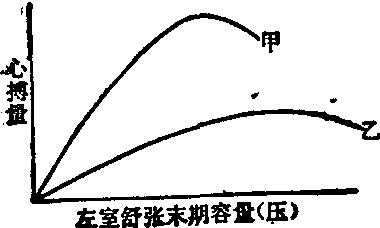 心肌舒张时,I带不超越肌节的中线。这是因为向宁蛋白和向肌凝蛋白阻碍肌纤蛋白上的作用点与肌凝蛋白呈球状的头部相结合。心肌除极时,肌膜外的钙离子(Ca++)进入细胞,同时储藏在肌浆网及线粒体的Ca++被大量释放。Ca++与向宁蛋白结合,从而改变向宁蛋白及向肌凝蛋白的分子构形,使肌纤蛋白的作用点显露,促进肌凝蛋白头部与肌纤蛋白相结合,形成了二者连接的横桥。此过程中所需要的能量,是由Ca++激活肌凝蛋白ATP酶提供,使ATP水解为ADP及无机磷而产生能量。肌凝蛋白与肌纤蛋白的结合使肌纤蛋白向肌节中央滑行,肌节缩短,心肌纤维收缩。这一过程称为兴奋收缩耦联(excitation contraction coupling)。 心肌收缩性决定于肌浆网Ca++转运,线粒体产生ATP和肌凝蛋白ATP酶活性的程度。近年的研究提示在心肌有病变、缺血和(或)肥厚时可有以下改变: ❶肌浆网对Ca++摄取和释出减低; ❷线粒体呼吸活力和磷酸化减低,心肌细胞中线粒体所占据的容量较正常为少,从而减少能量的供应; ❸肌凝蛋白ATP酶活性减低,主要见于重度压力负荷过重。此外,心肌缺血时,由于葡萄糖无氧酵解增加,乳酸产生增多,细胞发生酸中毒,氢离子即与Ca++竞争,因而影响Ca++与向宁蛋白的结合。以上改变均可使心肌收缩性减低,可能为各种心血管疾病引起心力衰竭的心肌超微结构和生化代谢基础。心肌收缩性减退也可反映在肌节的长度上,其在2.0~2.2μ时可产生最为适宜的收缩。心力衰竭时,肌节长度常>2.2μ。 (2) 心脏前负荷的改变: 在舒张末期,左心室所承受的负荷称为左心室前负荷,是由舒张末期室内压力传递到心室壁造成,因此也决定于左心室舒张末期容量(相当于肌纤维舒张末期长度)。临床常用左心室舒张末期压或称左心室充盈压作为左心室前负荷的指标。根据Frank-Starling定律,心搏量与左心室充盈(或左心室舒张末期容量)密切相关,此种关系可用心室功能曲线来表示(图2)。在正常心脏,左心室功能曲线的升支随着舒张末期容量增加而升高,表示心搏量在升高,直到该曲线的峰点。此为最适宜的舒张末期容量或充盈压 (正常人约为12mm-Hg)。但若超过此最适宜的容量或压力,心搏量反而降低,曲线即从峰点下降。由此可见,心脏的排血功能是依赖于适合的前负荷。如前负荷不足,则心搏量降低。在前负荷过重的疾病,如二尖瓣关闭不全或主动脉瓣关闭不全,心脏是通过左心室扩张,左心室充盈压增高来维持其心搏量,这即为心脏在负荷过量时的一种代偿功能。但当左心室充盈压增高,超过一定的限度时,心搏量下降,临床上就出现心力衰竭。