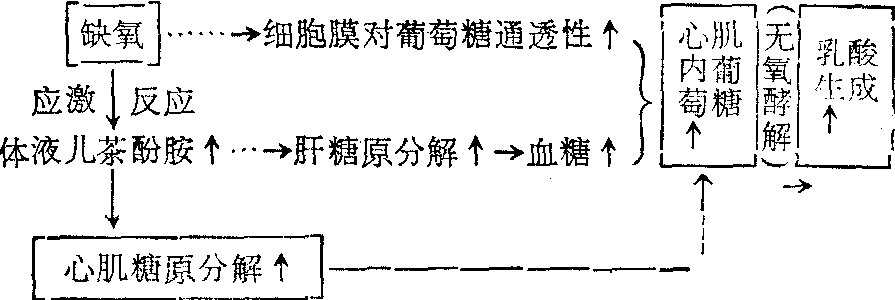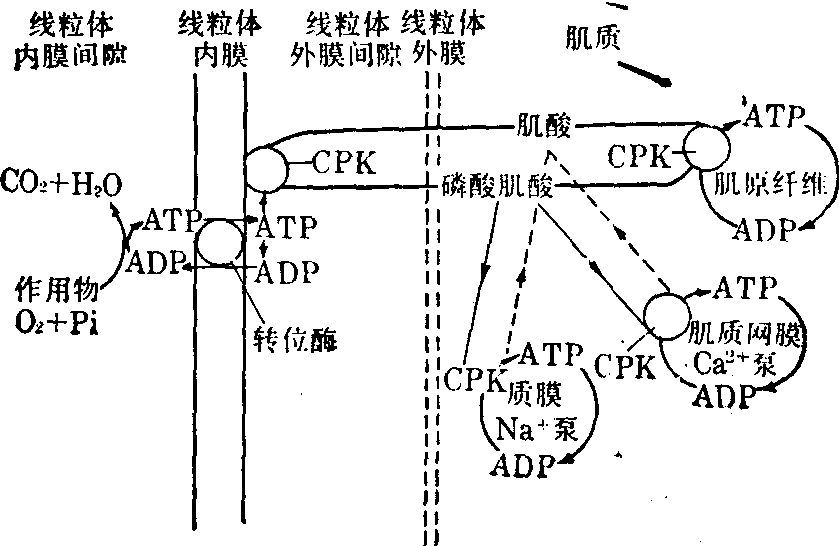 脂肪酸作为心肌的主要供能物质,其在细胞内的浓度是很高的(可达血浆脂肪酸的20倍)。心肌的脂肪酸有三个来源: ❶血浆中的游离脂肪酸。空腹、禁食、脂餐后及糖尿病患者血脂肪酸浓度高。在这些情况下心肌氧化脂肪酸增强,尤其在高脂餐后及严重糖尿病时心肌几乎全部靠氧化脂肪酸及酮体供能,呼吸商可降至0.7; ❷血浆脂蛋白(主要是乳糜微滴及极低密度脂蛋白)。心肌中脂蛋白脂肪酶的活性较高,催化脂蛋白中的酯化脂肪酸水解为游离脂肪酸。某些激素可影响脂蛋白脂肪酶活性。如甲状腺素及肾上腺素可增强、胰岛素可降低该酶活性。心脏工作持续增强亦可使心肌脂蛋白脂肪酶活性增高近2倍。脂蛋白脂肪酶存在于血管壁内皮细胞上。饥饿及糖尿病动物心肌脂蛋白脂肪酶活性增高,而脂肪组织中该酶活性降低。在这些情况下,血浆脂蛋白中的脂肪酸被心肌利用较多,而进入脂肪组织贮存较少。 ❸心肌内脂肪酶催化其脂肪水解释出游离脂肪酸。实验表明大鼠心肌中脂肪酶活性很高,增强心肌工作及给予儿茶酚胺均可增高脂肪酶活性、使心肌脂肪含量降低。综上可见,心肌氧化脂肪酸的速度取决于血脂肪酸浓度及心肌对能量的需要程度。心肌工作增强时,能量需要增多,脂肪酸进入心肌细胞加快、脂肪酸的氧化增强。来自血中的游离脂肪酸的氧化一般占所耗用脂类的50%。未治疗的糖尿病患者,心肌氧化脂肪更多,而利用糖类更少。 心肌中糖原含量不高 (约占0.6%)。在正常生理情况下糖原的含量十分稳定。在长期禁食时心肌糖原含量非但没有减少,甚而有所增多。这是因为脂肪酸及酮体的大量氧化抑制了糖的利用并促进糖原的合成。糖尿病酮中毒时心肌糖原含量增加,原因自然很易理解。此外,肾上腺素、胰高糖素及甲状腺素均可通过cAMP一蛋白激酶体系增加磷酸化酶活性,从而促进糖原分解降低心肌糖原含量。再者,心肌缺血时,由于糖酵解增强亦导致心肌糖原含量降低。糖原及催化糖原分解的磷酸化酶在心肌中的分布是不均匀的: 心室多于心房,心内膜下多于心外膜下。在心室的心内膜下区及传导组织中糖原的含量最高。这种不均分布的生理意义可能与抗缺氧有关。 心肌可从血中摄取葡萄糖。血糖低于0.7g/L时,葡萄糖的摄取停止; 在此水平之上时其摄取速度受多种因素控制。胰岛素及生长素可促进葡萄糖进入心肌细胞; 心肌收缩增加或缺氧亦可使葡萄糖进入心肌加快; 而血脂肪酸浓度升高可使心肌对胰岛素的敏感性降低,从而阻止葡萄糖的摄取;脂肪酸氧化增强亦抑制葡萄糖的摄取。再者,心肌利用葡萄糖的能力不如骨胳肌强。心肌中糖酵解酶体系的浓度比骨胳肌低。葡萄糖的氧化并不经常是心肌的主要能量来源。仅在心肌缺血、缺氧时葡萄糖的利用有重要意义。然而,心肌利用乳酸的能力相当可观。在剧烈运动期间,心肌所需能量的60%来自血乳酸的氧化。在一般情况下,每天利用血乳酸之量约略等于葡萄糖。当然,二者被利用的比例受其在血中的浓度、心肌工作强度及氧供应状态等条件的影响。同时,葡萄糖与乳酸的利用还可互相制约。当血乳酸浓度升高时,心肌摄取、利用乳酸增多,而摄取利用葡萄糖减少。反之亦然。 总上可知,可被心肌用以供能的营养物质,不但种类多,而且在不同的生理及病理条件下其供能途径有所不同。但只要不是处于缺氧状态、心肌的供能总是依赖于需氧代谢; 无氧酵解所提供的能量还不足1 %。体育及体力活动有利于改善心肌的供能潜力。据报告,长期的体育锻炼可使心肌肌红蛋白含量增加35%,糖原含量增加30%,心肌摄取血糖能力增加165%,参加糖代谢的酶活性显著增高(己糖激酶可增加80%),氧化乳酸的能力增加260%,组织呼吸增加37%。并使心肌脂肪的代谢率增高,心肌内脂肪的含量降低。这对于提高心脏的工作能力及抗缺氧能力是非常有利的。 能量转运 众所周知,ATP的生成主要在线粒体,而能量的利用主要在肌原纤维、肌质网及肌膜等部位。这些耗能部位所获得的ATP并非从线粒体直接弥散而来。近年的研究证明在心肌细胞内线粒体所产生的ATP是通过由CPK同功酶 (见“肌酸、磷酸肌酸、肌酸磷酸激酶”条) 参加的磷酸肌酸途径而转移至耗能部位的。心肌中存在四种CPK同功酶(MM、MB、BB及线粒体CPK)。线粒体CPK活性占细胞内总活性的33~45%,存在于线粒体内膜的外侧。它对于从线粒体以磷酸肌酸形式输出能量有重要意义。肌型MM(占总活性的40.3%)存在于肌原纤维,杂合型MB(占21.2%)及脑型BB(占3.5%)存在于肌质中。心肌细胞内能量转运的具体途径见图2。 图2 心肌细胞内能量转运的磷酸肌酸途径 (Arch Biochem 173:34,1976,Saks VA,et al) 能量利用 心肌ATP的转换率很高。3 P-H3PO4参入心肌ATP的速度比骨胳肌大10~20倍。但心肌中磷酸肌酸的含量还不到骨胳肌的1/5。这说明心肌中ATP的生成、转运和利用处于紧张工作状态。心肌利用能量的效率是很高的。骨胳肌的最大工作效率为25%,心肌则为40%,其中60~80%消耗于心肌收缩。 心肌代谢及心肌收缩的病理 心肌缺血及缺氧 心脏活动高度依赖于需氧代谢。血流经心脏时,65~75%的氧被摄取。缺血及缺氧势必造成心脏功能障碍——收缩力减弱,兴奋性异常——心律紊乱,乃至心肌细胞结构的破坏——心肌梗死。损害的程度及性质与缺氧的严重程度、持继时间以及是否伴有缺血有关。 (1) 短暂缺氧、缺