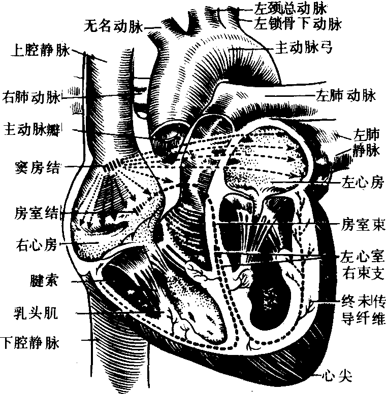 位于心壁内,由特殊分化的心肌细胞构成,具有兴奋性、传导性和自律性。心脏传导系统能产生并传导兴奋,以维持心脏的正常节律。它包括窦房结、结间束、房室结、房室束及浦肯野氏纤维。窦房结位于上腔静脉与右心房交界的心外膜深处,呈狭长椭圆形。结间束是窦房结与房室结之间的三条传导束。房室结位于房间隔下部偏右侧的心内膜深处。房室结发出的房室束(又称希氏束)沿室中隔下行再分为左、右束支,于左、右心室内膜下反复分支成浦肯野氏纤维。浦肯野氏纤维与心室肌联系。窦房结产生的节律性兴奋迅速传给心房肌并沿结间束传导至房室结。房室结的传导速度较慢,约延搁0.05~0.1秒才以较高速度沿房室束经浦肯野氏纤维传给心室肌。房室结的传导延搁,使心房肌收缩在先,心室肌收缩在后,从而保证心泵血功能的顺利进行。