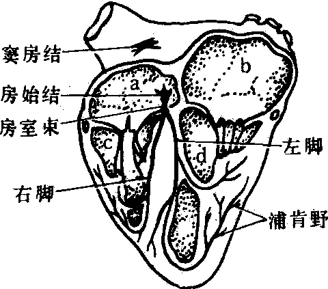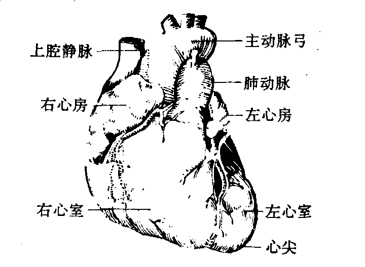 传导系 由特殊的心肌纤维构成,能自发产生和传导兴奋,维持正常心搏动的节律性。包括窦房结、房室结、房室束和浦肯野纤维。窦房结是心跳的起搏点,位于前腔静脉和右心耳间的界沟内,由薄而分支的结细胞网构成,被富有含血管的结缔组织隔开,内含许多交感和副交感神经纤维及神经节细胞,它们与心房的普通心肌纤维相连。房室结位于右心房冠状窦口附近,在房间隔的心内膜下,由排列不规则的小分支结细胞构成,与心房肌纤维及房室束的浦肯野纤维相连续。房室束沿室间隔膜部向下,分为左、右两脚,沿室间隔两侧的心内膜向下延伸,并通过隔缘肉柱(节制索)至乳头肌根部分散为浦肯野纤维,彼此交织成网分布于心室壁与普通心肌相接;左脚还分出隔支至室间隔。房室束、左右脚和浦肯野纤维有一薄层纤维鞘包裹,有蹄类此鞘较发达。传导系的疾患可导致心室的搏动失调或心房和心室的收缩节律紊乱。 心脏 心脏xinzang推动血液循环的心肌性中空器官。正常成人的心脏略大于拳头,重约 300克,略呈圆锥形,位于膈上两肺之间,略偏于左侧 ,心尖位于左下方。心脏分左、右心房和左、右心室四个腔,分别以房间隔和室间隔分开,左右 互不相通。右心房接受上下腔静脉回流的静脉血,并 将其引入右心室。右心室将血泵入肺动脉。左心房接受肺静脉的氧合血液,并将其导入左心室。左心室壁比右心室壁厚3倍,将血推送至全身器官。为了保证血液定向流动,心脏内有左、右房室瓣和左、右半月瓣。左侧房室瓣为二尖瓣,右侧为三尖瓣。左侧半月瓣为主动脉瓣,在左心室和主动脉的接合处。右侧为肺动脉瓣,位于右室和肺动脉的接合处。心脏瓣 膜闭合时产生心音,房室瓣关闭产生第一心音,半月瓣关闭产生第二心音。心室壁肌肉和大血管的振动参与心音的形成。心肌具有自身节律性收缩的性能。心内有特殊的传导系统(包括窦房结和房室结,希氏束及蒲肯野氏纤维),心肌细胞膜内外离子分布不同 ,产生跨膜电位。任何增加细胞膜通透性的因素,均 可使内外离子浓度发生改变,产生电位变化,称为动作电位。窦房结具有自发地产生动作电位的能力,是心脏的起搏器。窦房结所形成的冲动沿传导系统下传,产生电流,这种电流传至体表面,在体表面任意两点形成电位差,随着心脏有规律的搏动,产生一系列的电活动,用仪器记录成连续的曲线即称为心电图。近期研究证明心脏还具有内分泌功能,如分泌心钠素等,对心血管系统的功能调节起重要作用。 ☚ 骨髓涂片检查 心动周期 ☛ 心脏 心脏xinzang血液循环的动力器官。心脏(图1、2) 位于胸腔内,膈肌上方,两肺之间,前面是胸骨和肋骨,后面是食道和脊柱。它的大小似本人的拳头,形状似桃子,尖向下端偏左称心尖,底朝上偏右称心底。心底部有动静脉出入,活动度小,心尖不受牵连,活动度大。心脏(图3)为一中空的肌性器官,由中膈分为不相通的左右两半,若有异常通道,就形成某种先天性心脏病。每半侧又横分为上下两个腔,上面较小的叫心房,下面较大的叫心室,心房和心室有房室口相通。在房室口边缘附有瓣膜,这些瓣膜如同阀门,能自动地向心室开放,让血液由心房流入心室而不许返流。当患风湿性心脏病时,心脏瓣膜会发生病变而影响血液循环的正常进行。右心房与上、下腔静脉连通,右心室与肺动脉连通,左心房与肺静脉连通,左心室与主动脉连通。在主动脉和肺动脉的根部腔面,分别有三个袋状的瓣膜,它们也像阀门,防止血液由动脉返回心室。组成心脏的心肌细胞有收缩性,心脏的收缩和舒张则是因为这些心肌细胞工作的结果,好比水泵的一压一放,使血液不断由心脏排入动脉,又不断从静脉回到心脏。有些心肌细胞失去原有的收缩性特化成心脏的特殊传导系,包括窦房结、结间束、房室交界区、房室束及浦肯野氏纤维。窦房结可以发布心跳的 “命令”,沿特殊传导系传到整个心脏,心脏则按“命令”跳动。心脏本身的氧气和氧料由冠状动脉供应,一旦冠状动脉因病变梗塞,心肌血液供应减少,可以引起心肌梗塞,心绞痛等疾病。