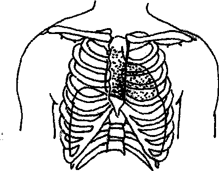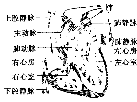 1.左心房 2.主动脉弓 3.上腔静脉4.下腔静脉 5.右心房 6.右心室7.肺动脉 8.肺静脉 9.左心房10.二尖瓣 11.三尖瓣 12.半月瓣 心脏结构及周围血管(箭头表示血流方向) 左房室内是来自肺部含氧多的血液,称动脉血;右房室内是含氧低的静脉血。中膈使动、静脉血不相混合,还使心脏泵出的血液分为两部分:一部分参与肺循环,另一部分参与体循环。某些先天性心脏病,是由于中膈愈合不全造成的。心脏自身的营养由冠状动脉提供,它由主动脉根部发出,产生病变(如痉挛或形成血栓)可引起心脏局部供血不足,造成心绞病,严重时发生心肌梗塞,甚至死亡。心肌与骨骼肌不同,具有自动节律性,但并非所有的心肌细胞都具有自动节律性。心脏有节律地收缩和舒张,决定于心脏的特殊传导系统,是由一些特化的心肌细胞构成,包括窦房结,房室结,房室束及其分支,浦肯野氏纤维等。其中窦房结的兴奋性最高,成为心脏的起搏点。正常成人安静时心率为60—80次/分,也叫窦性心率。超过100次/分,为心率过速;低于60次/分为心率过缓。如果心脏传导系统出现异常,将引起心率不齐。