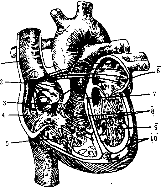 1.上腔静脉 2.窦房结 3.房室结4.右心房 5.右心室 6.左心房7.房室束 8.房室束左、右分支9.左心室 10.浦肯野氏纤维 心脏的特殊传导系统(1 2 3表示传导顺序) 心音主要是由心脏瓣膜关闭时发生振动形成的,心脏进行一次收缩和舒张过程中,可以听到两个心音。即第一心音和第二心音,它们分别由房室瓣和半月瓣关闭造成。当心瓣膜异常时(如充血、肿胀),常可听到正常心音之外有杂音。心电图是在人体体表记录到的心脏生物电变化,它是检查心脏机能状态的一个指标。心音和心电图在临床诊断中,具有一定参考价值。 ☚ 血凝和止血 血管 ☛ 心脏推动血液循环的肌性器官。位于胸腔内,在左右两肺之间,周围有心包。内有两个心房,中间为房间隔,两个心室,中间为室间隔。左房室口有二尖瓣,右房室口有三尖瓣,使血液呈单向流动。由于心肌节律性收缩,使静脉血从右心房进入右心室,通过肺进行气体交换以后变成动脉血,进入左心房再到左心室,然后运送到机体各部的动脉血管。 心脏 心脏心脏是高度特化的一段循环管道,能自发进行有节律的舒缩活动,以推送血液在血管中环流不息。心脏由三层膜组成,内层相当于血管的内膜,称心内膜; 中层相当于血管的中膜,称心肌膜,此层特别发达,是构成心脏的主要部分;外层相当于血管的外膜,称心外膜,表面被覆心包脏层。心脏壁有由致密结缔组织构成的支架,称心骨胳。心骨胳包括室间隔膜部、纤维三角和纤维环。心房和心室的心肌分别附着于纤维环的上面和下面,这两部分心肌不直接相连,由特殊心肌细胞组成的心脏传导系(参见“心脏传导系”条)联系。
