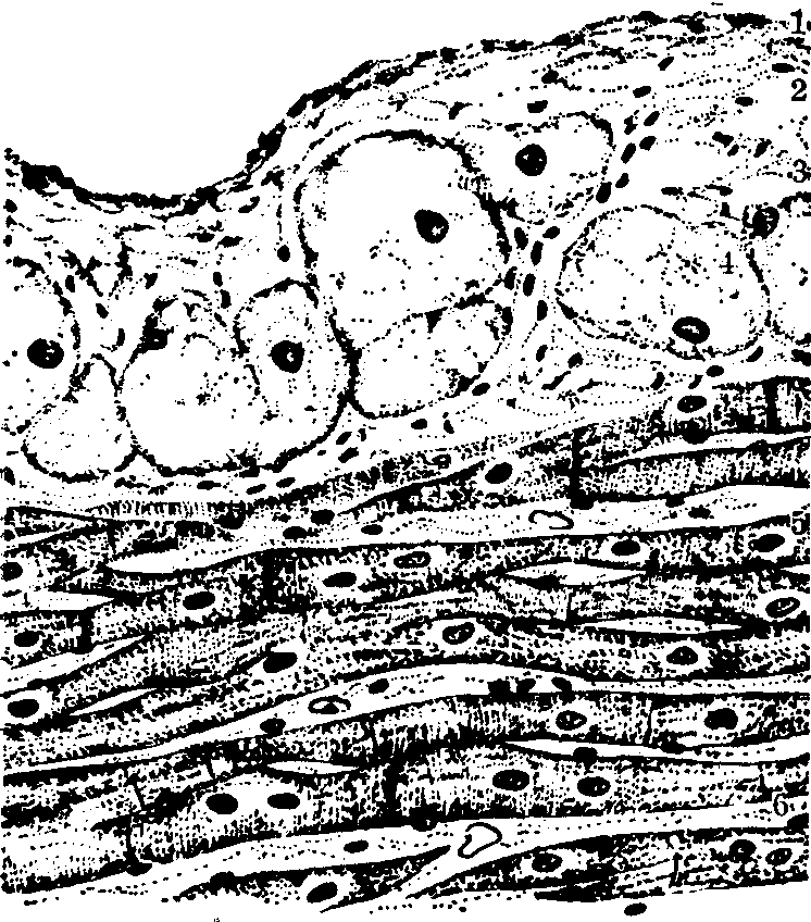 图1 心内膜和心肌膜 1.内皮 2.内皮下层 3.心内膜下层 4. Purkinje纤维 5.心肌 6.结缔组织
