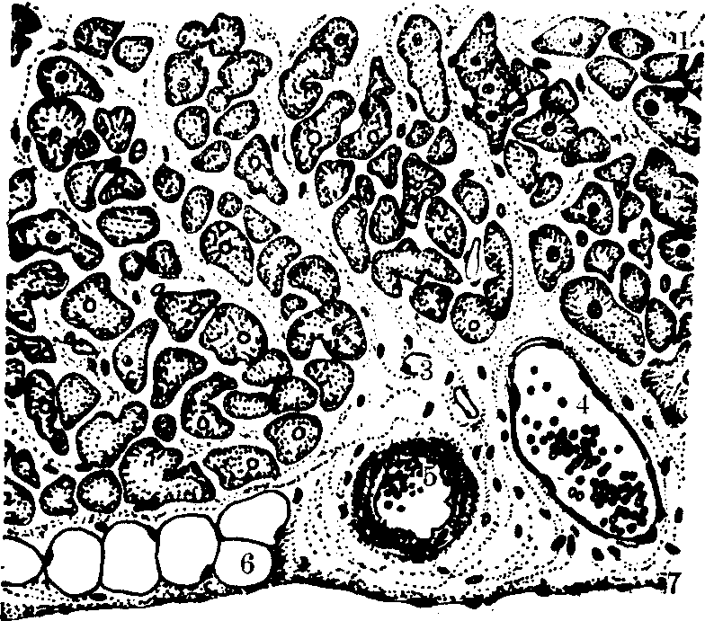 图2 心肌膜和心外膜 1.结缔组织 2.心肌膜 3.毛细血管 4.小静脉 5.小动脉 6.脂肪细胞 7.间皮 心骨胳 心骨胳为心脏壁的支架组织,也是心肌和心瓣膜的附着处,由致密结缔组织构成。心骨胳包括室间隔膜部、纤维三角及环绕房室孔和动脉口的纤维环。房室孔周围的纤维环还含弹性纤维和脂肪细胞。室间隔膜部的构造象腱膜,其内的胶原纤维分层,排列很规则。纤维三角中常有块状的软骨样组织,其中的细胞呈球形,象软骨细胞,细胞间质也显嗜碱性。在不同个体和不同年龄,心骨胳的构造有差异,老年时可钙化或骨化。 心瓣膜 为心脏的房室孔和动脉口处由内膜折叠成的瓣膜。瓣膜表面被覆内皮,中心为致密结缔组织,基部与纤维环相连。瓣膜近基部含少许平滑肌和弹性纤维。瓣的游离缘由腱索(纤维索)与乳头肌相连,以防心室收缩血压升高时瓣膜反转。主动脉和肺动脉半月瓣游离缘的中点有小卵圆形的加厚部,名小结。半月瓣向动脉的一面,内有较多的胶原纤维和弹性纤维起加强作用,以承受瓣膜关闭时逆流的血液。主动脉瓣和肺动脉瓣正常时没有血管。房室间的二尖瓣和三尖瓣可有小血管,但不到瓣膜的游离缘。心瓣膜中一般没有淋巴管,也未见神经。 心脏的血管、淋巴管和神经 营养心脏的血液由两支冠状动脉供应。两支血管分布的个体差异甚大。窦房结全由右冠状动脉分支供应的约占70%;全由左冠状动脉供应的很少; 少数由左右两支共同供应。左冠状动脉的供血量一般比右冠状动脉大得多,这同左心负荷大且肌组织丰厚是一致的。冠状动脉的分支由心外膜进入心肌膜,在肌纤维间形成丰富的毛细血管网。这些毛细血管汇成心静脉,经冠状窦入右心房,有一部分血液经几条小静脉直接导入右心房,这几条小静脉称心最小静脉(也名Thebesius静脉)。冠状动脉末端分支间有些吻合支,但甚小。如冠状动脉的一个主要分支阻塞,经吻合支通过的血流不足以供应该区的心肌,致使受损害区的心肌退化死亡。房室瓣的致密结缔组织中很少或没有血管,各瓣膜内皮下层的血液供应也不相同,二尖瓣的尖部比其它瓣膜丰富,幼年时比成年丰富。心脏传导系,尤其是窦房结和房室结,都有专支血管分布,血液供应丰富。心肌毛细血管的构造与骨胳肌的相似,但通透性比骨胳肌的大。心脏的淋巴管分三组: 较大的淋巴管与血管一同分布于心脏外面的沟中,回流淋巴到主动脉弓下和气管分支处的淋巴结; 心外膜结缔组织内的淋巴管; 心肌膜和心内膜淋巴管。心肌膜淋巴管丰富。毛细淋巴管起始于心肌纤维周围和心内膜,与心外膜的毛细淋巴管相通。心外膜的淋巴管再通入心脏表面的淋巴管。 心脏有交感和迷走神经。许多有髓和无髓神经纤维在心脏各层中成丛。迷走传出纤维先与心脏壁散在的副交感神经节细胞(大多位于心外膜深层)形成突触。这些细胞发出无髓节后纤维,分成串珠状末梢止于心肌纤维。心房的心肌还见类似运动终板状的末梢。心室的心肌中只见许多游离末梢,与心肌纤维相隔20nm,局部未见特化的结构。感觉神经纤维源于迷走神经节和胸1~4脊神经节细胞,在心内膜和心肌膜中形成游离末梢。窦房结、房室结和房室束有丰富的交感和副交感神经,其附近常见小神经节或神经节细胞。 ☚ 微血管 心脏传导系 ☛ 心脏 心脏heart主要由心肌构成,是循环系统的中枢。它的收缩和舒张是推动血液循环的动力,其解剖生理特点是: ☚ 心电学 心包 ☛ 心脏❶heart |