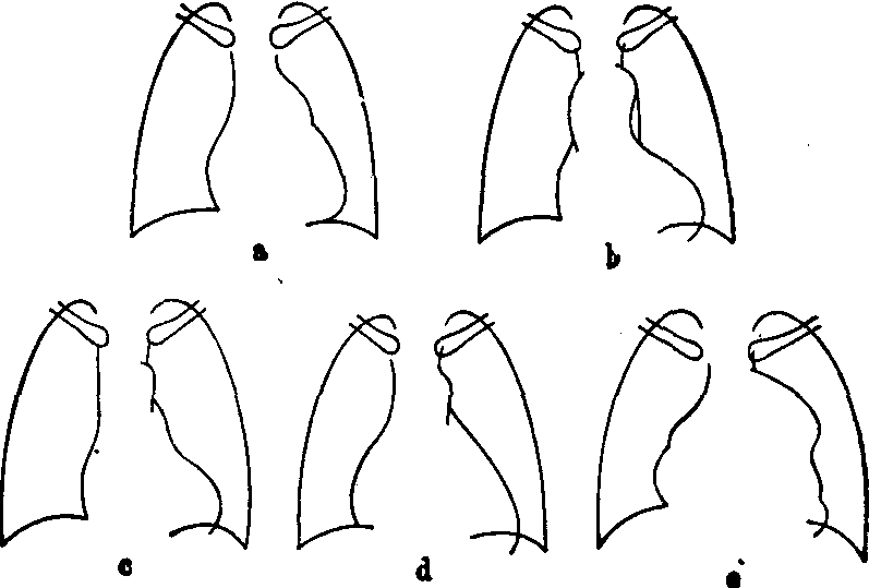 a.“二尖瓣”型 b.“主动脉”型; c. “二尖瓣”-“主动脉”型 d.“普遍扩大”型 e.其他(“怪异”型)