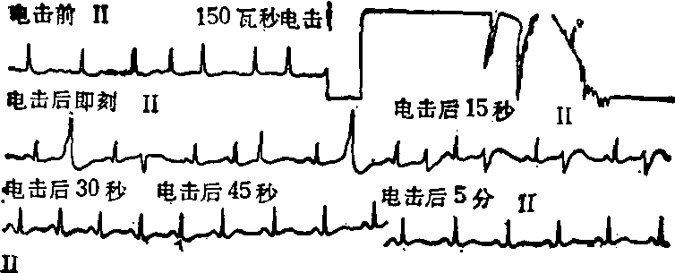 第一行示电复律前为心房颤动,心室率约每分钟80次,以150Ws的电功率进行复律,心电图基线漂移。第二行示电复律后片刻,心律已转为窦性,伴有多源性室性过早搏动。第三行示电复律后30秒,室性过早搏动消失,心律维持窦性。