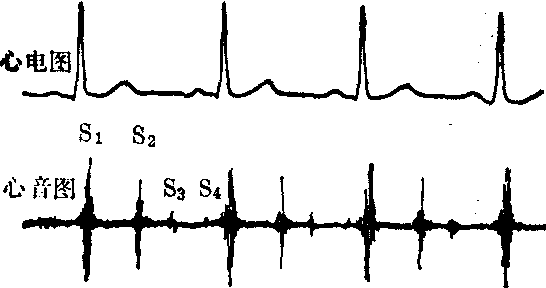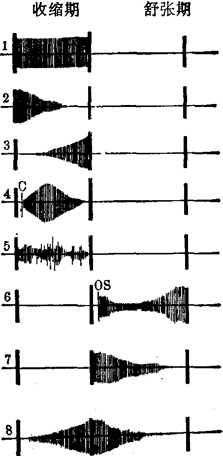 释义 | 心音图phonocardiogram用电子仪器把心音的振动转变为电流,并于放大后记录之图形,叫心音图。心音图可准确记录正常心音或杂音的发生时间、心音的强度和音调(频率),用以鉴别听诊上容易混淆的心音和杂音,对提高听诊的准确性有重要的辅助作用。一般心音图常和心电图同时记录。 心音图用电子仪器把心音的振动转变为电流,并于放大后的记录。可准确记录正常心音或杂音的发生时间以及心音的强度(振幅)和音调(频率),用以鉴别听诊器上容易混淆的心音和杂音,对听诊准确性的提高起重要的辅助作用。 心音图用心音图机将心脏产生的向胸壁表面传播的心音加以记录的曲线图形。 心音图 心音图心音图是将心脏搏动时某些机械活动如瓣膜的开闭、心肌的舒缩、大血管的运动及血流本身所产生的振动,用电子仪器放大滤波记录成的图形。目前最常用的是胸壁心外记录法,还有经食道、气管及心腔内的心音图记录法。心音图主要用于: 图1 正常心音图 心音分裂 是最常见的一种心音异常。第一心音的第二、三部分时距≥0.04s,称为第一心音分裂;第二心音第二部分的主动脉瓣及肺动脉瓣成分时距≥0.04s,称为第二心音分裂。第一心音分裂大多属生理性。第二心音分裂有三种: ❶正常呼吸性分裂,即吸气时分裂,呼气时消失,多见于儿童和青年。 ❷病理性宽分裂,即呼气和吸气都有分裂,吸气时更明显。见于右心室心排血受阻和电激动延迟(如右束支传导阻滞)等。呼气和吸气分裂时距固定不变者,称固定性分裂,是房间隔缺损的特征之一; ❸逆分裂也称反常分裂,见于左心室排血受阻和电激动延迟(如左束支传导阻滞)时,主动脉瓣关闭音反常地发生在肺动脉瓣关闭音之后,则当呼气时IIA更落后于ⅡP而使分裂加重。吸气时ⅡP后移,ⅡP与ⅡA接近或重叠使分裂减轻,甚至消失。 异常心音 也称额外心音,指正常心音以外的,历时短促的振动波。 收缩期额外音 有喷射音和收缩中、晚期喀喇音二种。 喷射音: 也称收缩早期喷射性喀喇音,是在S1后出现的额外振动,频率和振幅均较高,历时0.02~0.06s,与S1中心成分时距为0.03~0.10s,最易在心底部描记到。主动脉性喷射音可向心尖部传导,不易受体位和呼吸影响;而肺动脉性喷射音则呼气时增强。 收缩中、晚期喀喇音: 也称收缩中、晚期非喷射性喀喇音,频率为85~150Hz,历时0.01~0.08s,易受体位和呼吸影响,有时可突然出现,又突然消失,通常在心尖部最易描记到。 舒张期额外音 有以下四种。 开瓣音(OS): 发生在等长舒张期,最常见于二尖瓣狭窄,在心音图上为中或高频率低振幅振动,发生于S2后0.05~0.12s处,历时0.01~0.03s,与心尖搏动图的0点同时出现,在心尖部及沿胸骨左缘第四肋间最易录到。其后常伴有低或中频率舒张期杂音。S2-OS时限与二尖瓣狭窄程度成反比,并随心率而变动。三尖瓣开瓣音,与二尖瓣开瓣音基本相似,但它易在胸骨下端录到,深吸气时增强。 奔马律: 按额外音出现的时间有: ❶舒张早期奔马律出现在S2后0.14~0.18s处,频率一般为50~80Hz,振幅较高,常超过S2中心成分的2/3。左心室性者,在心尖部左侧卧位时最易录得,不受呼吸影响; 右心室性者,在剑突下或胸骨下端左缘易被录得,吸气或轻度活动时振幅增大。 ❷舒张晚期奔马律也称收缩期前奔马律,通常在P波开始后0.06~0.15s,时间短促,中频,振幅较高,常>S1中心成分的1/3。 ❸舒张中期奔马律也称重叠性奔马律,是前述两种奔马音重叠而成,多发生在明显窦性心动过速,舒张期缩短和房室传导时间延长时。 肿瘤扑落音: 在心音图上与开瓣音相类似,通常出现在S2后0.08~0.12s处。 心包叩击音: 通常发生在主动脉瓣成分后0.08~0.11s,振幅和频率较高,但持续时间较短,一般为0.08~0.10s,易在心尖部及胸骨下端左缘处录得。 起搏器音 是一种心外性额外音。对放有心脏起搏器者,有时在心尖部内侧及胸骨左缘第四、五肋间可出现与起搏器电脉冲同步的收缩期前额外音,通常为高频率,发生在S1前0.08~0.12s,在心电图起搏脉冲波后6ms左右。此音是由于起搏脉冲电流渗漏,刺激肋间神经或肌肉,引起肌肉收缩所致。在暂停起搏时,即行消失。 人工瓣膜额外音 在人工机械瓣膜替换术后,可产生一系列额外音。目前常用人工机械瓣有球笼型、碟型。所产生的额外音,是由于球瓣或蝶瓣开闭时撞击金属环或其支架所引起,故也称人工瓣开瓣及关瓣喀喇音。 人工二尖瓣额外音 在二尖瓣人工机械瓣替换术后,收缩期在心尖部可出现人工二尖瓣关瓣喀喇音。舒张早期在胸骨左缘下端,可出现人工二尖瓣开瓣喀喇音。两者在心音图上均为高频率、高振幅,历时较短的2~3次振动。前者历时0.015~0.02s,出现在心电图Q波开始后0.06~0.08s,平均0.073s; 后者历时为0.01~0.15s,出现于ⅡA开始后0.07~0.15s,平均0.11s。 人工主动脉瓣额外音 主动脉瓣人工瓣替换术后,在心底及心尖部,可分别记录到人工主动脉瓣开瓣喀喇音及关瓣喀喇音。心音图上两者均为高频率、高振幅振动,前者出现在S1二尖瓣成分后0.07s处;后者出现在相当于ⅡA处。 心脏杂音 在心音图上为一连串振幅高低不等、疏密不均、具有一定形状和历时较长的振动波。分析杂音的心音图时应注意其时相、振幅、频率、形状、持续时间及与心音或额外心音间的关系等。根据血液动力学,将收缩期杂音分为喷射性和返流性两种; 舒张期杂音分为心室充盈性和返流性两种。不间断地贯穿整