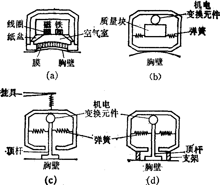 释义 | 心音测量 心音测量在心脏运动过程中,由心肌的舒缩和瓣膜的开放与关闭而引起的心内和邻近大血管内的血流冲击及血管振动音,称为心音。由心脏和邻近大血管内血液湍流和涡流所引起的振动音,称为心杂音。在一个心动周期中,正常心脏可能出现第一心音、第二心音、第三心音以及第四心音。心音和心杂音的振幅极低,接近人的听觉阈值。各类心音和心杂音的频率成分不同,频率范围宽达0.1~2,000Hz,其中经常测量的频率范围大约为20~1,000Hz。由于心音和心杂音与心脏活动周期、瓣膜状态等有密切关系,故心音的检测是临床诊断和生理研究中的重要手段,用以提供心脏功能的重要信息。 图1 正常心音图 动图、阻抗血流图及超声心动图等同步记录,为各种生理测量提供时间参考。 心音图仪 一般由传感器、放大器、滤波器和记录器等部分组成。 (1)心音传感器:心音传感器主要功能是拾取心音,把声波转变为电量。心音传感器可分为体表心音传感器和心内心音传感器二种。 ❶体表心音传感器:主要用于从胸壁上检测心音。按结构可分为经空气室传递振动的空气传导型和不经空气室传递振动的直接传导型; 按变换形式可分为动圈式、压电式和电容式等;按变换特点可分成位移型、速度型和加速度型等;几种心音传感器的结构简图如图2所示。图中(a)为空气传导型心音传感器,传至胸壁的心音通过开口部进入空气室,推动带有线圈的纸盆在恒定磁场中运动,从而感应出电势; (b)为加速度型心音传感器,由一弹性元件上的质量块检测胸壁振动的加速度,再通过压电材料转换成电量,具有形体小,频率特性好、抗干扰能力强等优点。(c)与(d)分别为直接接触式的悬挂型和放置型结构,胸壁振动直接经顶杆加到压电元件上转换成电压。此外,利用热风速计原理可检测心音,如图3所示。用一塑料杯和皮肤密切接触,由热线感知胸壁振动产生的空气流动。这种传感器具有低阻抗及较高的信噪比,对人体的扰动小; ❷心内心音传感器:把微型高频压力传感器设置在心导管端而组成,通过心导管术直接进入右心区和左心区,同时检测心内血压波形和心音,检出信号经滤除20Hz以下的血压成分后,即可得到心音信号(参见“血压测量”条)。 图2 几种心音传感器的结构 图3热线式心音传感器 (2)心音滤波器:为便于观测各种心音和心杂音,临床应用中需对心音信号进行滤波处理; 为滤除心尖搏动和脉波成分及高频噪声,也需在电路中采用适当的滤波器。为了使心音图记录与听诊相比较,心音图机常采用的滤波器有两种。 ❶中频记录或“听诊器”型,只滤掉低频声音,放大后的频率范围为30~1,000Hz; ❷对数型,具有相当于听诊器和耳朵的双重滤波效应,能显著地滤掉低频振动,只使高频通过,并且对频率越高的振动增益越大,从而使高频波的记录与人耳听诊相似。有些心音图机采用低频、中频、高频三种或四种心音滤波器,根据临床所检查的心杂音的频率和强度,适当选择。 (3)放大器和记录系统: 根据心音图记录器的频率响应,心音放大器有直接型和调制型两种。直接型心音放大器可与频响高的记录器相联,如喷笔式记录器,可记录比300~400Hz更高频率的振动,光线示波器和磁带记录仪的频响更高。此外,还可采用示波器观察和拍摄记录。若采用频响较低的墨水笔式或热笔式记录器记录心音图,则需采用调制型放大器,先对心音信号进行包络检波,然后再对80或100Hz载波进行调制,从而记录出心音包络线图。 ☚ 心输出量测量 脉搏测量 ☛ |