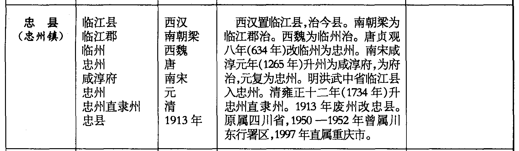 西汉置临江县,治今县。南朝梁为临江郡治。西魏为临州治。唐贞观八年(634年)改临州为忠州。南宋咸淳元年(1265年)升州为咸淳府,为府治,元复为忠州。明洪武中省临江县入忠州。清雍正十二年(1734年)升忠州直隶州。1913年废州改忠县。原属四川省,1950—1952年曾属川东行署区,1997年直属重庆市。