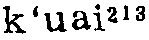 ❷会也;能也。白居易《有感》诗:“莫养瘦马驹,莫教小妓女。后事在目前,不信君看取。马肥~行走,妓长能歌舞。三年五岁间,已闻换一主。借问新旧主,谁乐谁辛苦?”快与能为对举之互文,快行走,犹云会行走也。虞集《苏武慢》词:“数卷残书,半枚破砚,聊表秀才而已。道先生~写能吟,直是去之远矣。”《张协状元》戏文:“小子~说梦,又会解梦。”快与会为对举之互文。《董西厢》三:“只唤做先生解经理,解的文义差,争知~打诗谜。”言怎知会打诗谜也。《北词广正谱》五《中吕宫》白仁甫《蔓青莱》《李克用》剧:“自从那盘古时分天地,便有那汉李广、养由基,他也不似这般~射。”言不似这般会射也。《举案齐眉》剧四:“我做秀才~噇饭,《五经》《四书》不曾惯。”快噇饭,犹言会吃饭也。噇音床。《昊天塔》剧四:“我做将军~敌斗,不吃干粮则吃肉。”快敌斗,犹言会战斗也。《太平乐府》九高安道《哨遍套》《皮匠说谎》:“~做能裁,着脚中穿,在城第一。”《诈妮子调风月》剧:“向这洛阳城,少甚末(么)能言~语官媒证。”又:“道我能言~语说合成,我说波娘七代先灵。”先灵,元作先天,不叶韵,非,天系灵之误字。《酷寒亭》剧四:“着一个能行~走的解子,便解将去。”《梧桐雨》剧四:“虽然是~染能描,画不出沉香亭畔回鸾舞,花萼楼前上马娇。”《铁拐李》剧楔子:“火坑里消息我敢踏,油镬内钱财我敢拿。则为我能跳塔,~轮䥷。”《赵氏孤儿》剧四:“凭着我~相持,能对垒,直使的诸邦降伏。”《雍熙乐府》六《粉蝶儿》套《十面埋伏》:“能飞也飞不出齐田单火牛阵即墨城密匝匝连环阵,~逃也逃不出孙武子长蛇阵乱纷纷八卦图。”以上快与能,均为对举之互文。 快 ☚ 叉 揸 ☛ 快 快好。《陈抟高卧》剧四:“命不快,遭逢着这火醉婆娘。”不快犹言不好。 ☚ 没兴 村 ☛ 快 快kuài如云好。辛弃疾《满江红》:“清可漱,泉长滴。高欲卧,云还湿。快晚风吹赠,满怀空碧。”(3—1887)王之道《西江月·和张文伯谢曾子修送酒》:“黄菊正怀彭泽,白衣俄致江州。登高余醉快扶头,此贶义兼情厚。”(2—1149) ☚ 夸舌辨 款段 ☛ 快读音k·uai(ˋ),为uai韵目,属ai—uai韵部。苦夬切,去,夬韵。 ❶与“慢”相反,速度大。 ❷从速;赶紧。 ❸接近;快要。 ❹锐利;锋利。 ❺爽快。 ❻高兴;痛快。 上一条: 𦳋 下一条: 夬 快1. 表祈使的语气副词,用于催促、命令、请求。2. 干脆,索性。《丁兰刻母》(贤孝):“人家舀给了妈妈一碗饭,她还不敢用,一碗饭了我快省下给给叫娃娃用。”《寡妇种田》(贤孝):“我快给账主子做饭,油饼子面茶烧上。” 快k‘ uɛi44❶刀锋利:镰刀磨~了。 ❷速度高: 跑得~。 ❸时间马上到: 我的生日 ~了。 ❹称心: ~意恩仇。《说文》: “快,喜也”。《广韵》: “称心也,可也。” 《增韵》: “爽快也,急疾也。”《辍耕录》: “世谓有疾曰不~。” 快〔kuai〕1. shangt: 你~去!moux shangt mongl! 2.ras:这把刀很~。ad zhenb ndendnend ras hent. 快活 〔kuai·huo〕 rut guat;kueb hol. 快乐 〔kuai le〕jid nkiand. 快手 〔kuai shou〕 shangtdoul. 快要 〔kuai yao〕 doub lies:~来了。doub lies lol jul. 快kuai213[k′uai]❶痛快,畅快 ⊳今旦客遛野~(今天玩得很痛快)。 ❷富足, 富裕 ⊳伊厝𠲥真~(他家很富裕)。 ❸动作行为的数量多,够受 ⊳今旦行野~(今天走路走得够受) |今旦乞日头曝~去(今天让太阳晒惨了)。 快《广韵》苦夬·夬;kuài‖kuài见下。 快ㄎㄨㄞˋkuài二2851①名刀刃。吴语。上海松江。②名筷子。吴语。江苏太仓、昆山。上海崇明。浙江鄞县、象山、镇海。◇ 《菽园杂记》:「舟行讳『住』,以『箸』为『快』。」③动用器具舀水。东北官话。辽宁沈阳〖 〗。④形平安;好。官话。元无名氏《渔樵记》:「相公问王安道:『哥哥好么?』我说道:『~!』」⑤形麻利;利索。江淮官话。安徽合肥〖 〗。江苏涟水〖 〗。⑥形容易。⑴吴语。浙江金华岩下〖 〗。佢学手艺吓农很~气的。⑵闽语。福建顺昌埔上〖 〗。⑦形富有。闽语。福建福州〖 〗、闽侯洋里〖 〗。⑧形快乐;愉快。古方言。《方言》第三:「逞、晓、恔、苦、快也。…自关而西曰~。」⑨数九。闽语。广东潮州。翁辉东《潮汕方言・释言》:「俗呼九为~。…世人以十数为满足,如:十足十全等。数若至九,谓快到满足也。」   快;快速;迅速kuài kuàisù xùnsù【同】 都可用作形容词;都表速度高。 【异】 “快”侧重于走路、做事比通常花的时间短;可用于多种场合,使用范围较广;通用于口语和书面语;可以作补语。此外,还有灵敏、锋利、愉快等意思;“迅速”没有这些意思。除作形容词外,还可以用作副词,表示时间上接近,即将出现某种情况,例如:“他上大学快满3年了”;“迅速”没有副词的用法。[例]鲁迅《社戏》:“这时船走得更~,不多时,在台上显出人物来,红红绿绿的动。”“快速”多用于交通工具的行驶和机器的运转;多用于书面语;一般不作补语,也不常作谓语。只作形容词。[例]汽车~行驶在国道上。“迅速”侧重于非常快,所表示的程度比“快”高些;多用于动作行为和事物的发展变化;多用于书面语;一般不作补语。只作形容词。[例]碧野《月亮湖》:“这座边疆古城的~变化也是的确令人惊喜的。” 【反义】 快—慢 缓 迟 迟钝 悲/ 迅速—缓慢 迟缓 舒缓
