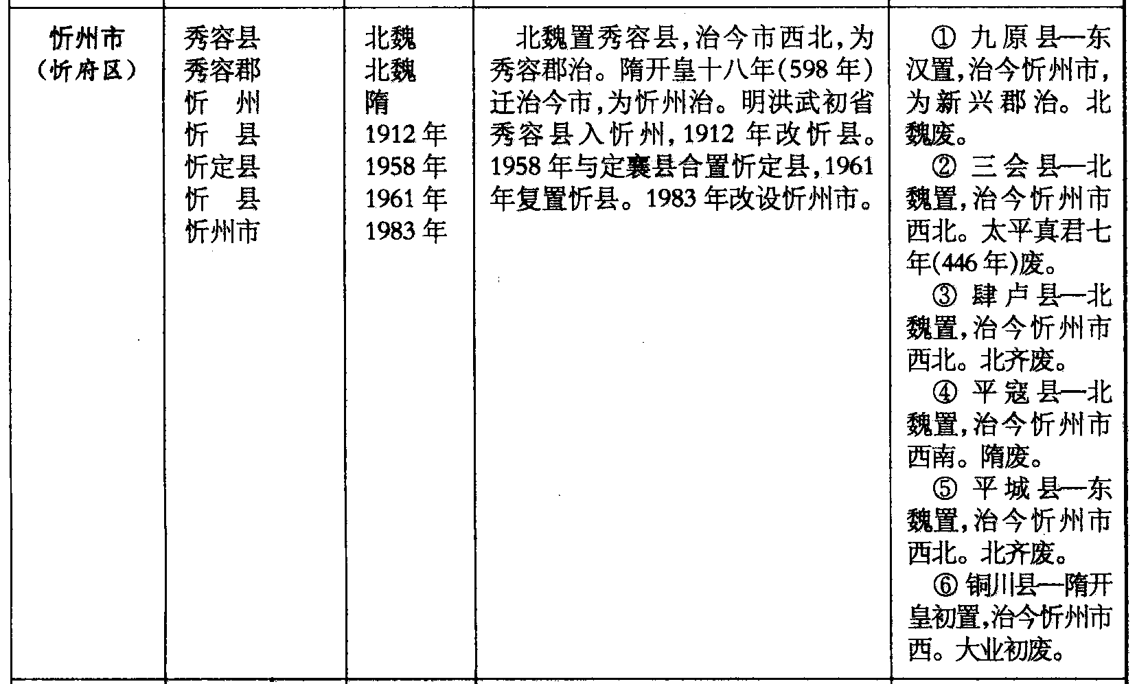 忻州市(忻府区)秀容县秀容郡忻州忻县忻定县忻县忻州市北魏北魏隋1912年1958年1961年1983年北魏置秀容县,治今市西北,为秀容郡治。隋开皇十八年(598年)迁治今市,为忻州治。明洪武初省秀容县入忻州,1912年改忻县。1958年与定襄县合置忻定县,1961年复置忻县。1983年改设忻州市。❶ 九原县—东汉置,治今忻州市,为新兴郡治。北魏废。❷ 三会县—北魏置,治今忻州市西北。太平真君七年(446年)废。❸ 肆卢县—北魏置,治今忻州市西北。北齐废。❹ 平寇县—北魏置,治今忻州市西南。隋废。❺ 平城县—东魏置,治今忻州市西北。北齐废。❻铜川县—隋开皇初置,治今忻州市西。大业初废。