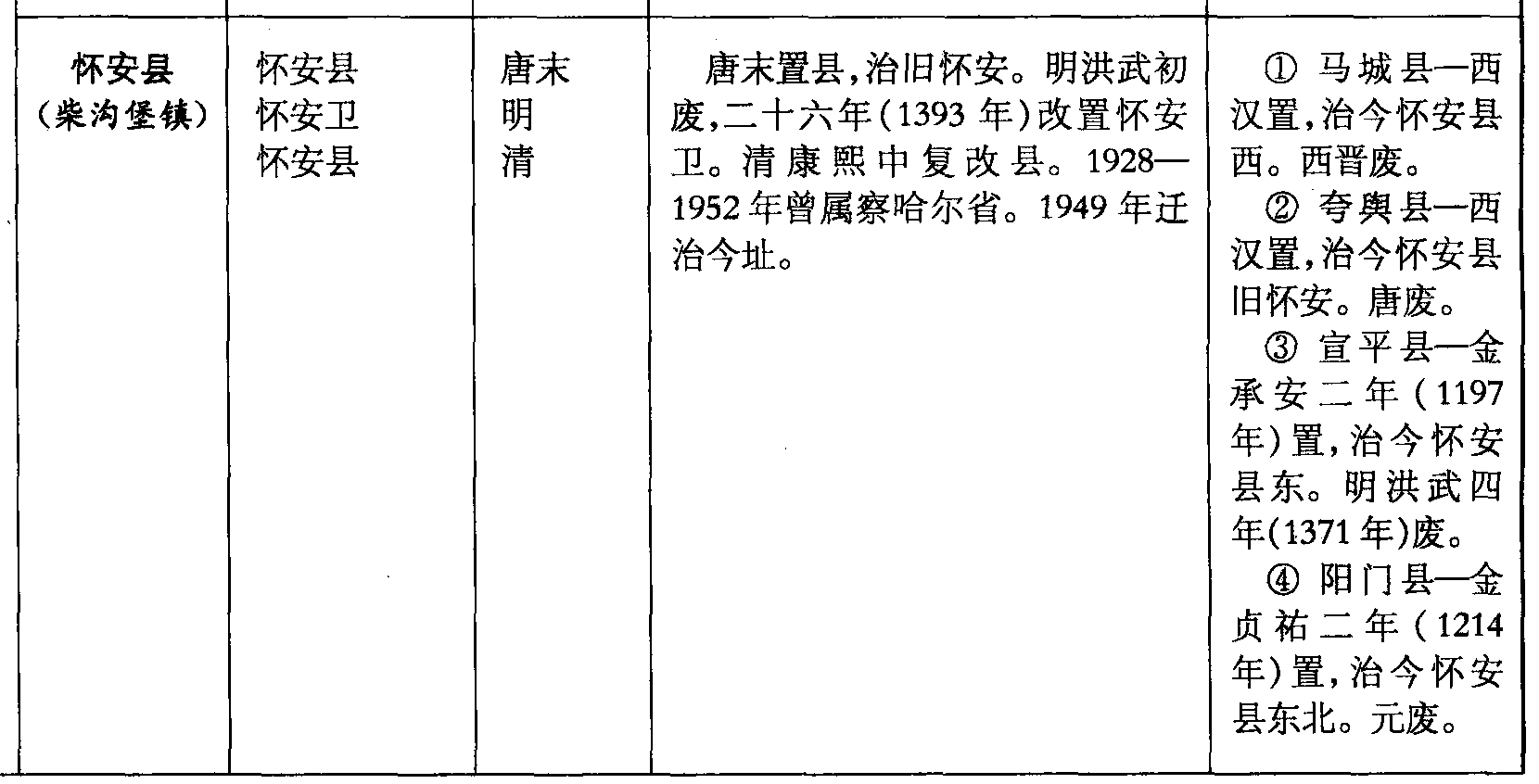 怀安县(柴沟堡镇)怀安县怀安卫怀安县唐末明清唐末置县,治旧怀安。明洪武初废,二十六年(1393年)改置怀安卫。清康熙中复改县。1928—1952年曾属察哈尔省。1949年迁治今址。❶ 马城县—西汉置,治今怀安县西。西晋废。❷ 夸舆县—西汉置,治今怀安县旧怀安。唐废。❸ 宣平县—金承安二年(1197年)置,治今怀安县东。明洪武四年(1371年)废。❹ 阳门县—金贞祐二年(1214年)置,治今怀安县东北。元废。