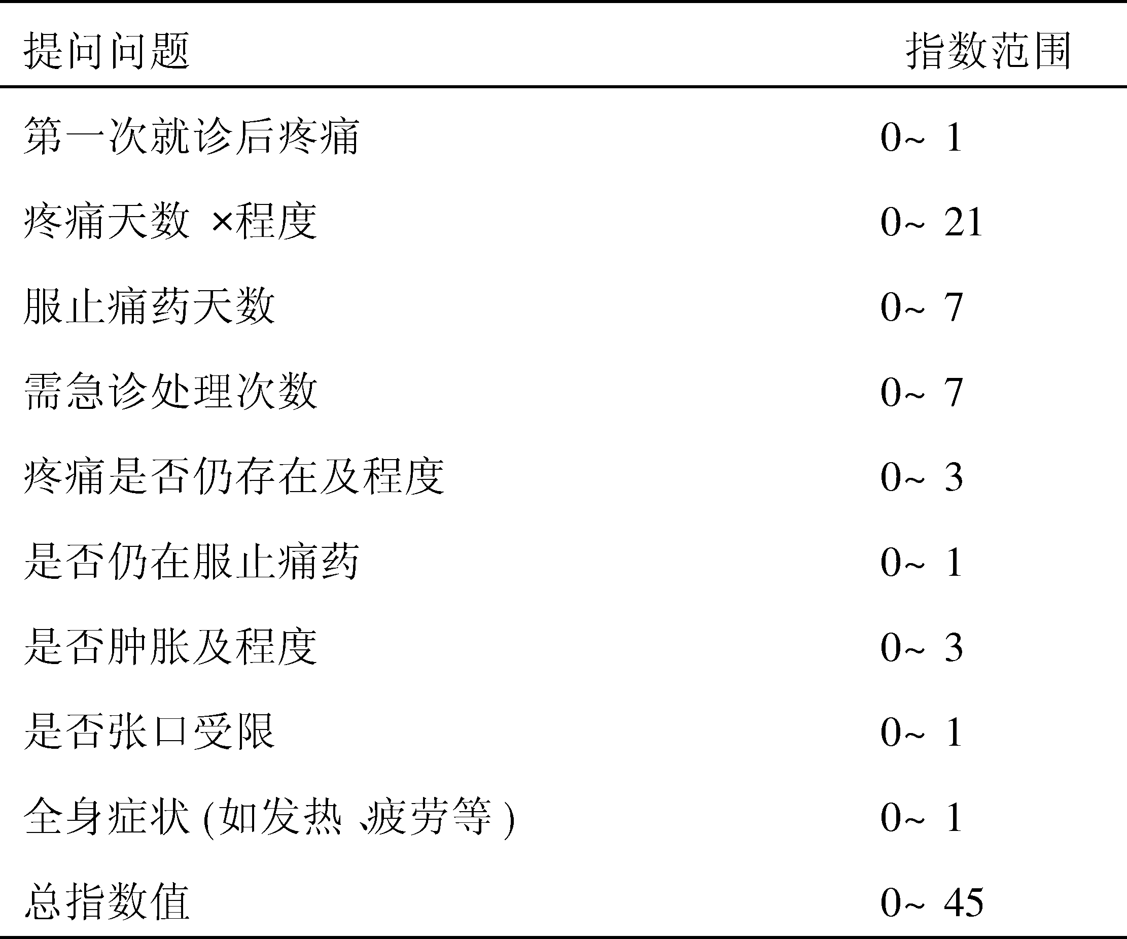释义 | 急性发作症状指数 急性发作症状指数index of acute attacking symptomRimmer等于1993年提出:急性发作是根管治疗期间的常见并发症,但对此仍无确切和统一的诊断指标。为便于对“急性发作”这一重要临床表现进行准确系统的研究,作者设计了急性发作症状指数评价表(见下表)。其中每相关指数都设至少两个不同的提问问题,以保证患者尽量准确的描述自觉症状。 急性发作症状指数评价表 肿胀程度:无肿胀记0,轻度肿胀1,中度肿胀2,重度肿胀及面部不对称3。利用此评价表可比较相关问题(如比较对疼痛程度的描述和服用止痛药情况)的回答,使医生更准确地掌握患者的真实情况,并了解患者的心理耐受力。另外,治疗过程中总指数值的减低或升高可反映治疗效果的好坏,同样,此评价表亦可用于比较不同治疗方案的效果,对临床科研和临床管理都有一定价值。但此表不涉及根管治疗前的临床与X线表现,其主要观察的仅是评估根管治疗期间的临床症状变化情况。 ☚ 镇静深度 营养状况主观评价法 ☛ |