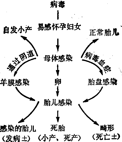 发病期 不同病毒,进入机体的部位及靶器官的部位不同,病毒病的发病过程也有不同表现。 (1)局部病毒病: 病变部位是病毒进入的皮肤或粘膜表面(表面感染)。潜伏期一般较短。流感是这一类病毒病的代表。病毒首先在细支气管的上皮细胞内、而不是在上呼吸道细胞内增殖。这可能是因为上呼吸道表面被对热稳定的粘蛋白α抑制物覆盖,病毒不易或不能附着于上呼吸道细胞。当病毒首先在细支气管上皮细胞内增殖,释放出大量病毒及神经氨酸酶时,由于细胞纤毛的机械运动,病毒扩散到上呼吸道并且降低分泌粘液的粘度成为水液,使上呼吸道细胞表面易受病毒的感染。上呼吸道细胞受病毒感染后,细胞被破坏的机理还不清楚。其他如轮状病毒引起的腹泻,腺病毒、单纯疱疹病毒、70型肠道病毒引起的眼部疾病,以及传染性软疣等均属局部病毒病。 (2) 经呼吸道再到靶器官的病毒病: 这类疾病包括天花、麻疹、风疹、水痘及腮腺炎等。其潜伏期较局部病毒病长,平均在10天以上。除发病的前几天外,一般在潜伏期时没有传染性,因此认为病毒虽然经过上呼吸道传染,但未必在呼吸道上皮细胞内增殖。有人用犬瘟热病毒通过鼻腔感染雪貂时发现,病毒最初不在呼吸道上皮细胞内增殖,而首先在颈部淋巴组织中出现,以后扩散到纵隔淋巴结,肠系膜淋巴结,肝、脾的网状内皮细胞和粒细胞中,病毒经过1周左右的增殖,才开始在皮肤、呼吸道、肠道和尿道上皮细胞内出现。人类麻疹、风疹、天花等的发病机理很可能与犬瘟热病毒在雪貂的实验性感染相似。腮腺及其他唾液腺与口腔很近,并且有腺管直接连接,但腮腺炎病毒的感染途径并不是直接从口腔经过腺管到腮腺的,而最可能是经过血液然后定位于某些较易感的组织。1948年Henle等用该病毒人工感染儿童,发现患者排出病毒的时间是在感染后11~15天,即腮腺炎症状出现前2~6天。临床上也可见到没有腮腺炎症状、只有睾丸炎或脑炎的腮腺炎病毒感染。直接给猴子腮腺内注入腮腺炎病毒,发生腮腺炎的潜伏期为5~8天,而自然感染时潜伏期为18~21天,说明病毒并不直接进入靶器官增殖。 (3) 经消化道再到靶器官的病毒病: 经消化道传播的病毒都没有包膜,因为有包膜的病毒对胃酸肠液很敏感,其感染性易被破坏。 大多数肠道病毒在肠内增殖,呈不显性感染,少数进入血流到靶器官引起疾病,如脊髓灰质炎病毒引起的麻痹症,柯萨奇、ECHO等病毒引起的心肌炎、脑膜脑炎等。 口是脊髓灰质炎病毒侵入机体的部位,病毒先在口咽部或肠道增殖。在疾病发生以前,可经常在喉和粪便分离到病毒,发病1周后则很难在咽部分离到病毒,但病毒继续在粪便排出,持续几星期之久。病毒从口咽粘膜到扁桃体及颈淋巴结或从肠粘膜到集合淋巴结到肠系膜淋巴结增殖,造成病毒血症。病毒可直接到中枢,也可通过神经传播到中枢而引起中枢神经系统症状。 甲型肝炎的发病机理可能与上述类似,病毒首先在口咽或肠粘膜细胞增殖,然后经淋巴到血流,最后到靶器官引起肝脏的病症。 (4) 由节肢动物传播的全身感染或个别靶器官感染:属于全身感染的疾病有黄热病、西尼罗脑炎等;属于个别靶器官感染的疾病有乙型脑炎、森林脑炎、圣路易脑炎等。凡经叮咬传播的病毒,除了在局部增殖外,可同时通过淋巴及血流感染其他细胞,这可能是潜伏期较短的原因。病毒增殖部位包括血管内皮细胞,淋巴结、肝、脾的网状内皮细胞,从而产生病毒血症。靶细胞破损是疾病产生的原因,如黄热病时肝细胞的破坏。 病毒侵入中枢的途径通常有两条: ❶通过血流及血脑屏障到达中枢。属于这一类的疾病有由节肢动物传染的病毒性脑炎,如乙型脑炎、Murray山谷脑炎、圣路易脑炎、马脑脊髓炎、森林脑炎等。病毒首先在感染部位及血管壁内皮细胞内增殖,然后在脑内增殖引起脑炎。 ❷沿神经轴索传到中枢。狂犬病病毒则属于这一类。将狂犬病病毒实验接种于小鼠的一肢,18天后切除接种病毒的一肢,可保护小白鼠免于死亡。但是,中枢神经系统一旦被病毒侵入,病毒可以很快在全部中枢神经系统中查到,以后传播到全身其他器官,而病毒血症却很低,不易查出。唾液腺在疾病发作前就被感染(猫、狗在发病前1~3天)。唾液腺病毒滴度可高于脑。 脊髓灰质炎病毒可通过血流直接到中枢,也可沿神经轴索到达中枢。前者的潜伏期较后者为短。脊髓灰质炎病毒先在口咽或肠粘膜内增殖,然后通过淋巴及血流到达其他组织。猴实验性经口感染所产生的病毒血症,用小量抗体可阻止麻痹发生,而沿神经轴索传播的则需要大量抗体才能阻止麻痹发生,而且经血流直接感染中枢的潜伏期较短,因而证明可直接通过血流感染中枢神经。沿神经轴索传播到中枢神经也有很多证据,如病毒感染一侧肢体,麻痹一般发生在同侧; 感染部位越接近中枢,发生麻痹便越早。流行期切除扁桃体,或进行某种预防接种则较易产生麻痹,前者产生延髓性麻痹,后者为同侧脊髓性麻痹。 (5)先天性病毒病: 怀孕期内感染某些病毒可引起死胎或胎儿畸形发育。目前已知可引起先天性感染产生胎儿畸形的,主要是风疹病毒及巨细胞病毒。单纯疱疹病毒、水痘病毒和柯萨奇B组病毒也可引起胎儿畸形,但较少见。病毒感染胎儿的机理如图所示。 胎儿感染风疹病毒多是通过母体病毒血症而产生的。 胎内病毒感染机理示意 如病毒感