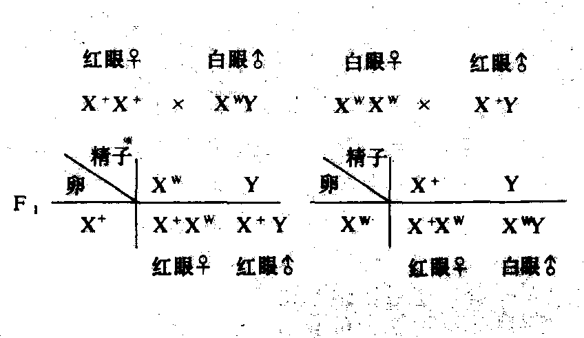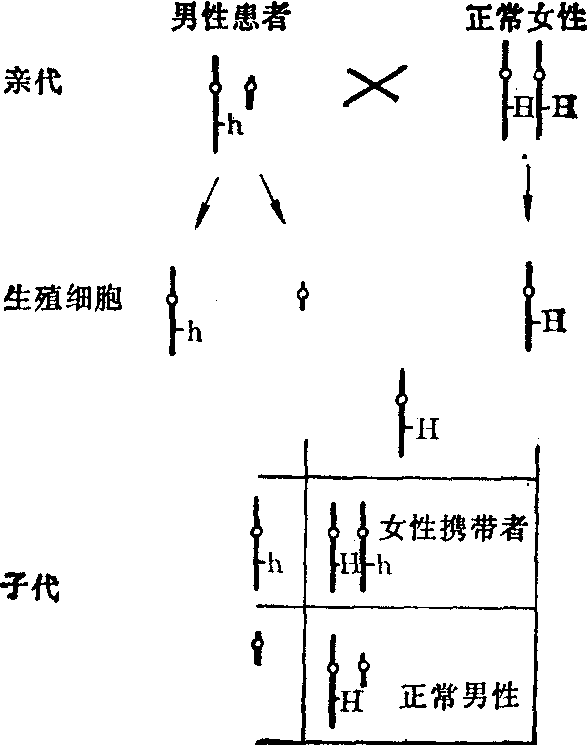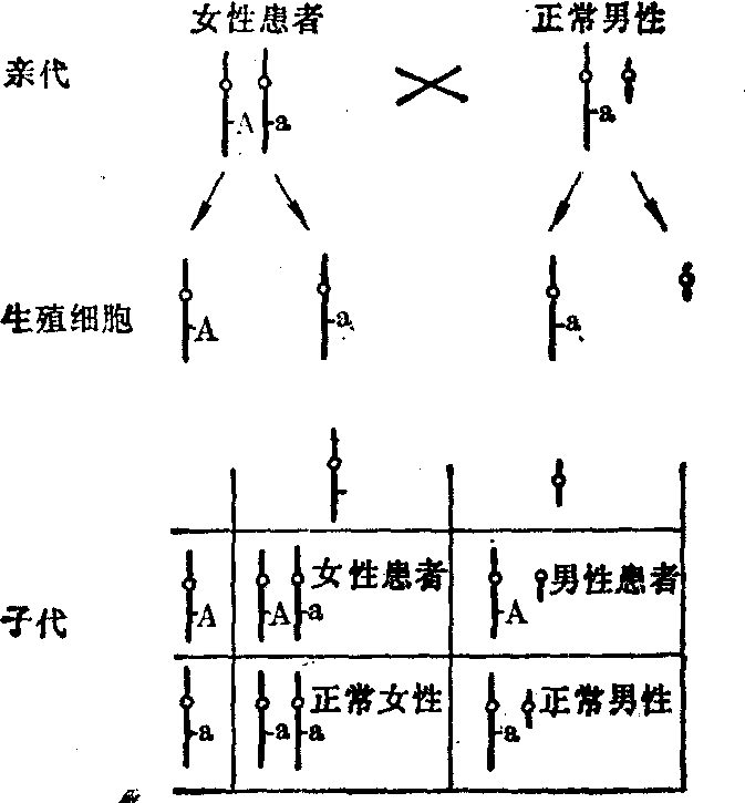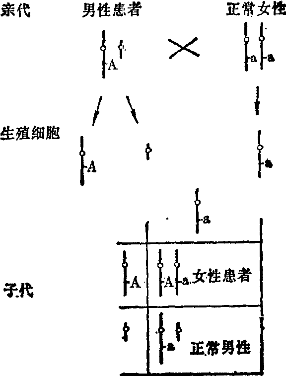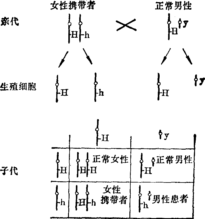 释义 | 性连锁遗传sex linked inheritance在真核生物中,性状的遗传与性别相联系的现象。又称伴性遗传。1910年,由摩尔根(T. H. Morgan) 首先在果蝇中发现。其后,在人类和许多动物,以及一部分雌雄异株的植物中,也都发现类似情况。 果蝇眼色性连锁遗传 性连锁遗传sex-linked inheritance系指位于性染色体上的控制基因同性染色体一起形成的遗传而言。人的染色体男女不同,女性为XX,男性为XY,因Y短小无X染色体的等位基因,故性连锁遗传又叫X连锁遗传。性连锁遗传,有显性遗传与隐性遗传之分,隐性遗传有父传女、母传子的交叉遗传规律。 性连锁遗传又称“伴性遗传”、“性染色体遗传”。位于性染色体上的基因所控制的性状的遗传方式。可分1.X连锁隐性遗传:一些遗传性状的隐性基因位于X染色体上,且Y染色体上没有相应的等位基因。因此。男性中只要有一个隐性致病基因,就会发病,此遗传方式男性患者远多于女性,且表现交叉遗传;2.X连锁显性遗传:一些遗传性状显性的基因位于X染色体上,且是显性的,此遗传方式女性患者多于男性,且可看到连续的遗传;3.Y连锁遗传:一些遗传性状的基因位于Y染色体上,X染色体上缺少相应的等位基因。限于男性遗传,即父传子,子传孙。 性连锁遗传 性连锁遗传一种基因如果位于性染色体(X或Y染色体)上,就叫性连锁,这种基因所控制的性状传递方式就叫性连锁遗传,或称性染色体遗传。性连锁遗传又可分为X连锁隐性遗传、X连锁显性遗传、Y连锁遗传三类。 图1 X连锁隐性遗传病女性携带者与正常男性婚配图解(H表示正常等位基因,h表示血友病基因) 图2 X连锁隐性遗传病男性患者与正常女性婚配图解(h为血友病基因,H为正常等位基因) 男性患者与正常女性婚配后,子代中男性都是正常人,女性都是携带者。即男性患者的致病基因只随X染色体传给女儿,不能传给儿子(图2)。 象上述X连锁遗传中,男性的致病基因只能从母亲传来,将来只传给其女儿的这种特殊传递方式叫交叉遗传。X连锁隐性遗传病系谱的特点是: ❶男性患者远多于女性患者,在一些致病基因频率低的病种中,看不到女性患者; ❷男性患者的双亲都无病,其致病基因是由携带者母亲交叉遗传而来; ❸由于交叉遗传,患者的兄弟、舅父、外甥、姨表兄弟中可能有该病患者,其外祖父也可能是该病患者 (这种情况下,患者的舅父中无该病患者)。但是,在临床上所看到的病例常常是在几代之中经过女性携带者来传 图3 一例血友病的系谱(郑×年家系) 递。血友病就是X连锁隐性遗传的,其系谱基本上反映了上述特点(图3)。X连锁显性遗传一些遗传性状或遗传病的基因位于X染色体上,如果这种基因的性质是显性的,这种遗传方式就叫X连锁显性遗传(XD)。在这种遗传方式中,女性的两条X染色体中任何一条具有这个显性基因的都将会引起发病;男性只有一条X染色体上可能具有这个基因。所以,女性的发病率要比男性约高一倍。女性患者多为杂合发病,与正常男性婚配后,子代中子女各有1/2将是发病患者(图4)。男性患者与正常女性婚配后,子代中女儿都将是该病患者,儿子都将是正常人(图5)。 图4 X连锁显性遗传病女性患者与正常男性婚配图解 X连锁显性遗传病系谱的特点是: ❶女性患者多于男性患者。 ❷患者的双亲中必有一个是发病患者。 ❸男性患者的女儿全部都将发病,儿子则都是正常人。 ❹女性患者的子女中各有1/2将是发病患者。 ❺可以看到连续的遗传。抗维生素D性佝偻病就是X连锁显性遗传的,其 图5 X连锁显性遗传病男性患者与正常女性婚配图解 系谱基本上反映了上述特点。图6 一个抗维生素D性佝偻病的系谱(卞×龙家系) Y连锁遗传 一种遗传性状或遗传病的基因位于Y染色体上,X染色体上缺少相应的等位基因,因此,这些基因将随Y染色体而传递,由父传给子,再传给孙,女性既不会出现相应的遗传性状或遗传病,也不传递有关基因。这种遗传方式就叫Y连锁遗传或限男性遗传。耳轮多毛就可能是一种Y连锁遗传的性状。 ☚ 常染色体遗传 限性性状与从性性状遗传 ☛ 性连锁遗传 性连锁遗传sex linked inheritance是病理基因位于性染色体上的一种遗传方式,又分为X及Y连锁遗传。 ☚ 隐性遗传 猫叫综合征 ☛ |