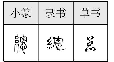 总zǒng古代名物 > 紡績類 > 製品部 > 絲織品 > 總 總 zǒng 絹之一種。晉·左思《魏都賦》:“錦綉襄色,羅綺朝歌;緜纊房子,縑總清河。”李善注引《廣雅》曰:“總,絹也。” 总本、总;分、支○本běn(形)主要的;中心的:~部|~流|~旨|~题|~干。 ○总zǒng(形)概括全部的:~店|~会|~局|~行|~部|~院|~校|~队|~账|~集|~纲|~则 |~机|~计划|~公司。 ●分fēn(形)一部分的;分支的:~店|~厂|~会|~局|~行|~部|~院|~校|~队|~账|~句|~册|~公司。 ●支zhī(形)分支;支派:~行|~店|~队|~脉|~流。 总zǒng〖动词〗 一、总括(1)。《谏太宗十思疏》:总此十思,宏兹九德。——总括这十个想到,就是要发扬光大那九种道德。 二、统领(1)。《待漏院记》:若然,则总百官,食万钱。——如果这样,那么就统领百官,享用优厚俸禄。 总總zǒng❶ 聚合,聚集。《尚书·盘庚下》:“无~于货宝。”《隆中对》:“将军既帝室之胄,信义著于四海,~揽英雄,思贤如渴。” ❷ 系结。《楚辞·离骚》:“饮余马于咸池兮,~余辔兮扶桑。”(扶桑:传说中的日出之处。) ❸ 总括。《荀子·不苟》:“~天下之要,治海内之众,若使一人。”魏征《谏太宗十思疏》:“~此十思,宏兹九德,简能而任之,择善而从之。” ❹ 统领,率领。《左传·僖公七年》:“若~其罪人以临之,郑有辞焉,何惧?”丘迟《与陈伯之书》:“中军临川殿下,明德茂亲,~兹戎重,吊民洛汭,伐罪秦中。”(戎重:重兵。) ❺ 全,都。陶潜《责子》:“虽有五男儿,~不好纸笔。”辛弃疾《永遇乐·京口北固亭怀古》:“舞榭歌台,风流~被雨打风吹去。” ❻ 总是。苏轼《饮湖上初晴后雨》:“欲把西湖比西子,淡妆浓抹~相宜。” 总*總zongD7DC ❶汇集;综合:~之/汇~/~起来说/把两笔账~到一块儿。 ❷全部的;全面的:~动员/~账/~攻击/~罢工。 ❸为首的;主要的;概括全部的:~纲/~则/~司令/~工会。 ❹一直;一向:天~不放晴/他一有事~找别人帮忙。 ❺毕竟:比起那些人来,他~要卖力一些吧。 总括 总括总(总共;总合;总计;括总;兼总) 包(包括;包举) 统(统统;统共;统括;统纪;统总;笼统)综(综括;综摄;该综) 蔽 共(共计;~有;一共;统共;拢共;通共;满共) 毕 合(合共;合计) 拢(拢总;拢共) 通扯 通类 一括 浑括 通约 通晐 最凡 猥计 表示总括:总(~共;~计;~之) 诸 均 都(全~;大~) 总括全部:概赅 总括一定范围内的全部:凡是 都凡 大凡 但凡 应是 总括起来说:总而言之 总而论之 总而括之 统而言之 究而言之 括以一言 说来道去 说来说去 蔽以一言 一言蔽之 一言以蔽之 总而言之,简要说来:要而言之 要而论之 总括性的话:一言抄百总 表示下文是总括性的话:总之 总括性用语:归根到底 归根结底 归根究底 归根究袛 归根结蒂 充类至尽 充类以尽 九九归一 九九归原 包孕总括:孕括 (总的包括:总括) ☚ 包括 包含 ☛