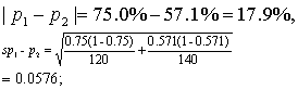 例2 某病患者用甲药治疗120人,治愈90人,治愈率75.0%;用乙药治疗140人,治愈80人,治愈率57.1%,试估计两总体治愈率的差值。