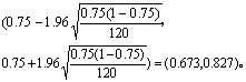 本例n=120,p=0.75,计算95%可信区间u0.05 =1.96代入式(1)得