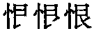 【提示】艮,上面不带点,不要错写成良; 中间的横宋体与左右两边相接,楷体与左边相接,与右边相离。 *恨hèn9画 心部 (1) 遗憾;后悔: 悔~|遗~终生|引为~事|相见~晚。 (2) 怨恨;仇视: 痛~|雪~|~透了|~之入骨。 恨 ☚ � 悔 ☛ 恨hèn古代形声字。从忄(心),艮声。声变如艮很狠、干汗例。怨,仇视。如:恨入骨髓。组词如:怨恨。引申为懊悔,令人懊悔或怨恨的事。如:遗恨。 恨★常◎常