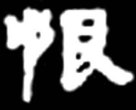 恨hèn❶怨恨。丁儀《厲志賦》:“恨騾驢之進庭,屏騏驥於溝壑。” ❷遺憾,感慨。馮衍《顯志賦》:“悼丘墓之蕪穢兮,恨昭穆之不榮。”張衡《西京賦》:“思比象於紫微,恨阿房之不可廬。” 恨读音h·en(ˋ),为en韵目,属en—in—un—ün韵部。胡艮切,去,恨韵。 ❶仇恨;仇视,怨恨。 ❷悔恨;不称心。 ❸遗憾;不满意。 上一条: 哏 下一条: 硍 恨xəŋ44❶仇恨,怨恨: ~死人了。 ❷~之深则反训为贪: ~食,贪吃,吃得多。 ❸犹豫: ~了半天,还是决定去参加会议。《说文》: “恨,怨也。从心艮声。” 恨〔hen〕 nzeb;nghed. 恨极 〔hen ji〕 nzeb toub nzebyangl. 恨{}三4360①动使人恨。⑴东北官话。东北〖 〗。⑵北京官话。北京〖 〗。这孩子多~人!⑶西南官话。湖北武汉〖 〗。这事真~人。②动想;盼望;巴不得。粤语。广东广州〖 〗。~咗好耐嘞盼了很久了‖大家都~你快啲嚟大家都盼望你快点来‖~佢快啲走巴不得他快点走。广东佛山〖 〗、从化〖 〗、斗门上横〖 〗、斗门斗门镇〖 〗、江门白沙〖 〗。③动压制;管制。西南官话。四川成都。李劼人《大波》第一部第十章:「妈的,他家特别,你把他们~得住么!」④动瞪。⑴中原官话。新疆吐鲁番〖 〗。⑵兰银官话。甘肃兰州〖 〗。新疆乌鲁木齐〖 〗。老李把儿子~给咧一眼。⑶西南官话。四川成都〖 〗。他䀦起眼睛把我~倒。高缨《鱼鹰归来》:「王自明䀦眼~了妇人一眼。」⑤动僵持。⑴中原官话。新疆吐鲁番〖 〗。有啥事情到办公室说去,~到这儿干啥呢?⑵兰银官话。新疆乌鲁木齐〖 〗。你不干,我也不干,咱们就都在这儿~下。⑥动羡慕;喜欢。粤语。广东广州〖 〗。佢哋呢度环境咁好,边个睇见都~呀他们这里环境这么好,谁看见都羡慕‖唔~得咁多嘅别那么羡慕人家‖咁曳嘅嘢冇人~那么赖的东西没人喜欢。⑦形可惜;惋惜。粤语。广东广州〖 〗。𠮶本书买唔到,几咁~呀那本书买不到,多可惜呀!⑧形(东西吃得太多,太甜,感到)腻。闽语。广东揭阳〖 〗。两碗甜面食落去到~死两碗甜面吃了下去腻极了。⑨副太。中原官话。江苏徐州〖 〗。人~老实也不好‖~孬的不想买,~好的又买不起。   恨hen遗憾。《史记·魏其武安侯列传》:“侯自我得之,自我捐之,无所~。”(侯:爵位的一种。捐:丢弃。) 恨hèn❶怨;仇视 △ 痛~|仇~。 ❷懊悔;遗憾 △ 悔~|相见~晚。 恨hèn