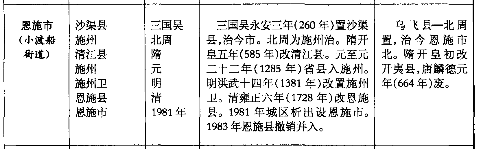 恩施市(小渡船街道)沙渠县施州清江县施州施州卫恩施县恩施市三国吴北周隋元明清1981年三国吴永安三年(260年)置沙渠县,治今市。北周为施州治。隋开皇五年(585年)改清江县。元至元二十二年(1285年)省县入施州。明洪武十四年(1381年)改置施州卫。清雍正六年(1728年)改恩施县。1981年城区析出设恩施市。1983年恩施县撤销并入。乌飞县—北周置,治今恩施市北。隋开皇初改开夷县,唐麟德元年(664年)废。
