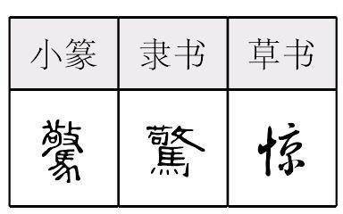 jīnɡ驚,形声,从馬,敬声,本义为马受到惊吓而狂跑,引申为在突然的刺激下精神紧张、使受侵扰而害怕不安等。近代俗字、《手头字》、《简化字表》简作“惊”,形声,从心,京声。 【辨析】 ❶“惊”又读liánɡ,悲伤,与“驚”不是等义简繁字。 ❷惊/警 见202页“警”。 |