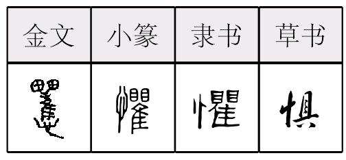 【提示】具, 上面是 , 中间三横,不要错写成两横的且; 中间三横宋体与左右两边相接,楷体与左边相接,与右边相离。 *惧(懼)jù11画 心部 恐惧;害怕: ~怕|~内|恐~|畏~|面无~色。 惧懼jù战国以来的形声字。从忄(心),瞿(qú)声。声母演变如且咀沮、求救例。战国文字和汉隶或省隹(zhuī ),只从两目在上,心在下。害怕义。如:临危不惧。组词如:恐惧。宋代以来从具旁行草书楷化或省一横,现规范为具旁,作惧。见《总表》。 惧懼★繁◎常★常◎异