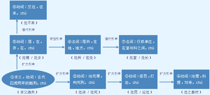 释义 | ![]() (處) ❶跟别人一起生活;交往。可作谓语,常带表示结果、趋向、程度、时间等补语。 老人的脾气很好,容易~|你跟他~熟了才能发现他有很多优点|经同志们劝说后,他们能很好地~下去了|长期以来,两人~得很好|我和小明在一起~了八年。 ❷存在;置身。可作带宾、带补谓语。 身~逆境|该球队一直~于青黄不接的困境|我们国家正~在一个伟大的社会主义建设时期。 ❸处罚。可作带宾、带补谓语。能带双宾语。常用在“被”字句中。 他被法庭~了徒刑|法庭不~他死刑,不足以平民愤|他因杀人被~以极刑|根据他犯罪的事实,~得了死刑~不了? ❹处置;办理。常构成固定词组或用作语素构成合成词。 ~之泰然|~理|审~|论~。 【词语】 处罚 处方 处决 处女 处女地 处世 处事 处死 处刑 处治 【注意】 又读chù,如:住处、处长、总务处。 字源解说 虎,既是声旁也是形旁,表示食人猛兽。處,金文 ![]() ![]() ![]() ![]() ![]() ![]() ![]() ![]() ![]() ![]() ![]() ![]() ![]() ![]() ![]() ![]() ![]() ![]() ![]() ![]() ![]() ![]() 附 文言版《説文解字》:処,止也,得几而止。从几,从夂。處,処或从虍。 附 白话版《说文解字》:处,停止,坐几(凳)而歇。字形采用“几、夂”会义。“處”,这是“处”的异体字,字形采用“虍”作边旁。 引申线索 ![]() 字源解说 虎,既是声旁也是形旁,表示肉食性猛兽。處,金文 ![]() ![]() ![]() ![]() ![]() ![]() ![]() ![]() ![]() ![]() ![]() ![]() ![]() ![]() ![]() ![]() ![]() ![]() ![]() ![]() ![]() ![]() ![]() ![]() ![]() ![]() ![]() ![]() ![]() ![]() 附 文言版《説文解字》:処,止也,得几而止。从几,从夂。處,処或从虍。 附 白话版《说文解字》:处,停止,坐几(凳)而歇。字形采用“几、夂”会义。處,这是“处”的异体字,字形采用“虍”作边旁。 引申线索 ![]() 【字族索引】 卜 处 【同音字】 chǔ chù |