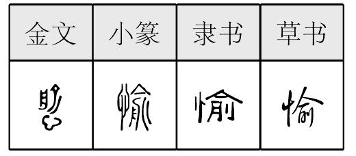 愉 金文; 篆yú[忄(心,意符)+俞(聲符)→愉(《説文》:“愉,薄也。從心,俞聲。《論語》曰:‘私覿(dí),愉愉如也。’”愉:和悅,快意〈愉快、愉悅、歡愉〉。)] 《詩經·唐風·山有樞》:“宛其死矣,他人是愉。”(忽有一天你逝去,徒讓他人去享受。) 愉 yú(12画)