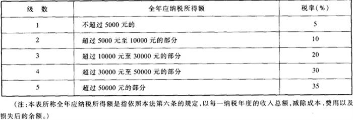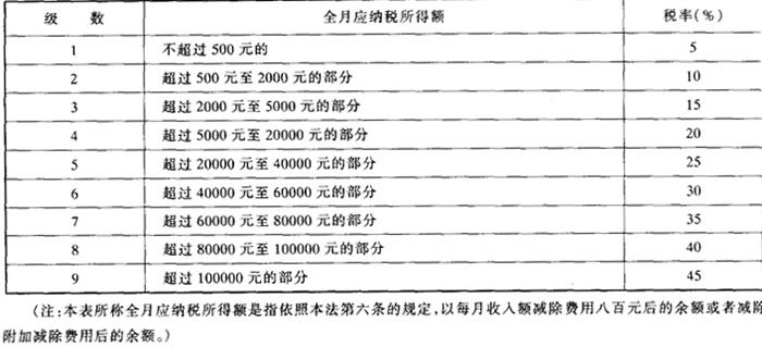 释义 | 中华人民共和国个人所得税法 第一条 在中国境内有住所,或者无住所而在境内居住满一年的个人,从中国境内和境外取得的所得,依照本法规定缴纳个人所得税。 在中国境内无住所又不居住或者无住所而在境内居住不满一年的个人,从中国境内取得的所得,依照本法规定缴纳个人所得税。 第二条 下列各项个人所得,应纳个人所得税: 一、工资、薪金所得; 二、个体工商户的生产、经营所得; 三、对企事业单位的承包经营、承租经营所得; 四、劳务报酬所得; 五、稿酬所得; 六、特许权使用费所得; 七、利息、股息、红利所得; 八、财产租赁所得; 九、财产转让所得; 十、偶然所得; 十一、经国务院财政部门确定征税的其它所得。 第三条 个人所得税的税率: 一、工资、薪金所得,适用超额累进税率,税率为百分之五至百分之四十五(税率表附后)。 二、个体工商户的生产、经营所得和对企事业单位的承包经营、承租经营所得,适用百分之五至百分之三十五的超额累进税率(税率表附后)。 三、稿酬所得,适用比例税率,税率为百分之二十,并按应纳税额减征百分之三十。 四、劳务报酬所得,适用比例税率,税率为百分之二十。对劳务报酬所得一次收入畸高的,可以实行加成征收,具体办法由国务院规定。 五、特许权使用费所得,利息、股息、红利所得,财产租赁所得,财产转让所得,偶然所得和其他所得,适用比例税率,税率为百分之二十。 第四条 下列各项个人所得,免纳个人所得税: 一、省级人民政府、国务院部委和中国人民解放军军以上单位,以及外国组织、国际组织颁发的科学、教育、技术、文化、卫生、体育、环境保护等方面的奖金; 二、国债和国家发行的金融债券利息; 三、按照国家统一规定发给的补贴、津贴; 四、福利费、抚恤金、救济金; 五、保险赔款; 六、军人的转业费、复员费; 七、按照国家统一规定发给干部、职工的安家费、退职费、退休工资、离休工资、离休生活补助费; 八、依照我国有关法律规定应予免税的各国驻华使馆、领事馆的外交代表、领事官员和其他人员的所得; 九、中国政府参加的国际公约、签订的协议中规定免税的所得; 十、经国务院财政部门批准免税的所得。 第五条 有下列情形之一的,经批准可以减征个人所得税: 一、残疾、孤老人员和烈属的所得; 二、因严重自然灾害造成重大损失的; 三、其他经国务院财政部门批准减税的。 第六条 应纳税所得额的计算: 一、工资、薪金所得,以每月收入额减除费用八百元后的余额,为应纳税所得额。 二、个体工商户的生产、经营所得,以每一纳税年度的收入总额,减除成本、费用以及损失后的余额,为应纳税所得额。 三、对企事业单位的承包经营、承租经营所得,以每一纳税年度的收入总额,减除必要费用后的余额,为应纳税所得额。 四、劳务报酬所得、稿酬所得、特许权使用费所得、财产租赁所得,每次收入不超过四千元的,减除费用八百元;四千元以上的,减除百分之二十的费用,其余额为应纳税所得额。 五、财产转让所得,以转让财产的收入额减除财产原值和合理费用后的余额,为应纳税所得额。 六、利息、股息、红利所得,偶然所得和其它所得,以每次收入额为应纳税所得额。 个人将其所得对教育事业和其他公益事业捐赠的部分,按照国务院有关规定从应纳税所得中扣除。 对在中国境内无住所而在中国境内取得工资、薪金所得的纳税义务人和在中国境内有住所而在中国境外取得工资、薪金所得的纳税义务人,可以根据其平均收入水平、生活水平以及汇率变化情况确定附加减除费用,附加减除费用适用的范围和标准由国务院规定。 第七条 纳税义务人从中国境外取得的所得,准予其在应纳税额中扣除已在境外缴纳的个人所得税税额。但扣除额不得超过该纳税义务人境外所得依照本法规定计算的应纳税额。 第八条 个人所得税,以所得人为纳税义务人,以支付所得的单位或者个人为扣缴义务人。在两处以上取得工资、薪金所得和没有扣缴义务人的,纳税义务人应当自行申报纳税。 第九条 扣缴义务人每月所扣的税款,自行申报纳税人每月应纳的税款,都应当在次月七日内缴入国库,并向税务机关报送纳税申报表。 工资、薪金所得应纳的税款,按月计征,由扣缴义务人或者纳税义务人在次月七日内缴入国库,并向税务机关报送纳税申报表。特定行业的工资、薪金所得应纳的税款,可以实行按年计算、分月预缴的方式计征,具体办法由国务院规定。 个体工商户的生产、经营所得应纳的税款,按年计算,分月预缴,由纳税义务人在次月七日内预缴,年度终了后三个月内汇算清缴,多退少补。 对企事业单位的承包经营、承租经营所得应纳的税款,按年计算,由纳税义务人在年度终了后三十日内缴入国库,并向税务机关报送纳税申报表。纳税义务人在一年内分次取得承包经营、承租经营所得的,应当在取得每次所得后的七日内预缴,年度终了后三个月内汇算清缴,多退少补。 从中国境外取得所得的纳税义务人,应当在年度终了后三十日内,将应纳的税款缴入国库,并向税务机关报送纳税申报表。 第十条 各项所得的计算,以人民币为单位。所得为外国货币的,按照国家外汇管理机关规定的外汇牌价折合成人民币缴纳税款。 第十一条 对扣缴义务人按照所扣缴的税款,付给百分之二的手续费。