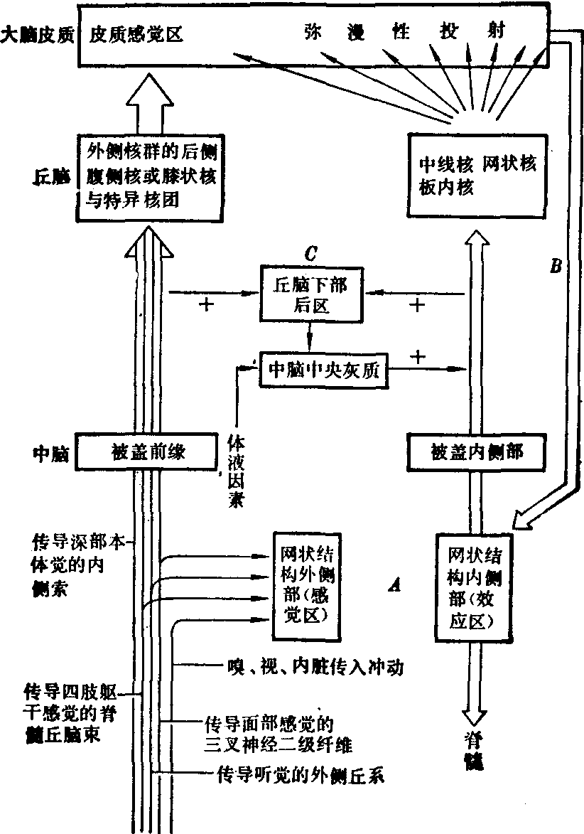 释义 | ![]() 主要责任者: 何伋,路英智,贺敬义等 责任方式: 主编 出版者: 天津科学技术出版社 出版地: 天津 字数: 290 千字 页码: 1-354 开本: 32 中图分类号: R749.93 装帧: 简 语种:中 定价:35.00 出版时间:2012-05 丛书多卷书否:否 书目简介:本册工具书共收录216条词条。 意识障碍disturbance of consciousness系指对周围事物如人物、时间、地点、状态的认识能力障碍及对客观刺激不能作出适当的反应而言。为精神、神经系统疾病常见的症状。意识障碍程度可与病情及神经系统疾病程度有关。 意识障碍对自身状况和客观环境认识能力的减退或丧失。主要表现为意识模糊、谵妄、昏睡、昏迷。多见于脑炎、脑血管意外、中毒性或感染性精神病和药物中毒等。参见“心理学”中的“意识障碍”。 意识障碍见“医药卫生”中的“意识障碍”。 意识障碍 意识障碍意识是指人所特有的对客观现实的反映。意识障碍是指人对客观现实不能形成准确的反映,可分为环境意识和自我意识两种障碍。 ☚ 知觉障碍 注意障碍 ☛ 意识障碍 意识障碍意识是机体对自身和环境的感知。人的意识是由意识内容和觉醒系统二个组成部分来体现的。意识内容是大脑皮质的活动,包括思维、记忆、定向和情感,并通过视觉、语言、技巧性运动和复杂的机体反应与外界环境保持正常的联系。觉醒系统的功能则是激活皮质,使之维持一定的兴奋性,使机体处于觉醒状态,从而在此基础上产生意识内容。当觉醒系统的不同部位受到不同程度的损伤时,便可产生程度不同的意识障碍。意识障碍是病情变化的信号,其轻重程度往往与病情变化相一致。意识障碍表现为意识混浊和意识内容变化两个方面。 图1 意识障碍发生机制 此外,业已证明,丘脑下部后区和中脑中央灰质是中枢内的激动驱动结构。丘脑下部后区发出纤维至中脑中央灰质,再由此发出纤维下行,并与上行激动网状结构联系。中枢内的这一激动驱动结构可被特异性上行激动系统的侧支纤维或丘脑下部外侧区的纤维所触发,同时也可被体液因素所触发,产生急需的激醒作用,这是一种起短暂作用的交通联系。另一方面,激动性网状结构也有纤维进入丘脑下部和中脑中央灰质,当上行激动网状结构向上影响大脑皮质的同时,也影响丘脑下部后区和中脑中央灰质。因此,丘脑下部后区和中脑中央灰质与激动网状结构之间形成了一个环路。故当丘脑下部后区和中脑中央灰质受损时,这个环路的功能就被破坏。例如,脑炎的昏迷具有阵发性质,就是因为上行激动系统的功能依然保存,当外界刺激达到一定阈值时,就出现短暂的觉醒,此时患者可对答问话,并具有简单的思维,但当刺激阈值一旦降低时,患者重又进入昏迷状态。 机体代谢障碍时的体内因素往往也可导致意识障碍。缺氧和缺血可使去甲肾上腺素的合成减少或停止,从而可使包括网状结构,特别是上行激动系统在内的脑组织的神经元之兴奋性极度降低,发生意识障碍。各种类型的酸中毒,特别是代谢性酸中毒(pH7~6.5),可使包括网状激动结构在内的许多脑组织的突触传递停止,致使网状激动结构与大脑皮质的功能联系丧失,从而发生意识障碍,严重者陷于昏迷。这也可能是尿毒症、糖尿病或其他类型酸中毒导致昏迷的重要原因之一。 脑组织本身的代谢障碍 (例如低血糖时脑组织能源供应不足)及中毒(如有机磷、麻醉剂和镇静剂等)均可影响或抑制上行网状激动系统的功能,引起意识障碍,严重时出现昏迷。 昏迷是严重意识障碍的表现形式。昏迷情况下伴发一些特殊的功能障碍,其中了解得最多的是呼吸、瞳孔、运动行为及脑电图的变化。了解这些功能变化的特征,有助于测知神经结构的受损部位及功能障碍的程度。 当大脑两半球或双侧间脑受损时或功能抑制时,大脑对低位呼吸中枢的节律性调节作用发生障碍,出现不稳定的周期性呼吸(Cheyne-Stokes呼吸)。中脑旁中央网状结构和脑桥头部的损伤或功能抑制,可引起规则的和持久的呼吸运动增强,称为中枢神经性通气过度。当低位脑桥被盖或延髓受损时,则可直接累及调节呼吸节律的基础中枢,表现为窒息或协调障碍,甚或呼吸暂停。 瞳孔的直径、形状和反应性是了解昏迷的重要线索。位于间脑至脑桥之间任何水平的神经中枢和传导径的损伤或功能改变都可影响瞳孔的大小和反应能力。当丘脑下部的前区受损或功能抑制时,即可阻断该区的传出冲动,使瞳孔缩小,对光反应受限;当间脑后区被盖受损时,光反射径路被阻断,瞳孔散大,并可出现自发的激动性收缩,表现为虹膜震颤。当第三脑神经受损时,由于阻断了副交感神经的传出纤维,瞳孔散大。第三脑神经核受损往往是双侧的,其结果是交感和副交感的瞳孔支配神经均有障碍,因此瞳孔固定于中等大小。脑桥被盖受损的结果是瞳孔缩小。脑桥出血的病例,瞳孔显著缩小,如同针尖,对光反应可一时性消失。 昏迷常伴有运动行为的变化。当大脑深部的运动传导径路遭受破坏时,往往出现去大脑皮质的效应,表现为肘、腕和指关节的屈曲,下肢伸直,跖部屈曲的特殊体位。若间脑后部与脑桥上部之间的较尾部受损时,则可伴发去大脑效应,即上肢伸展和内旋,同侧下肢伸直。脑桥被盖受损时,则可伴发上肢弛缓和下肢屈曲,或上下肢均出现弛缓。 意识障碍时,中枢神经系统功能活动的变化在一定程度上可从脑电图上