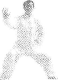 陈式太极拳式之一。定式时腿呈侧弓步,重心偏右腿,左腿微屈; 左手下置丹田处,右手横向展开。此式劲由左腿上缠至腰,下行于右腿,腰、肩、肘、手完整一气。练习时注意收中有放,放中有收。如图。